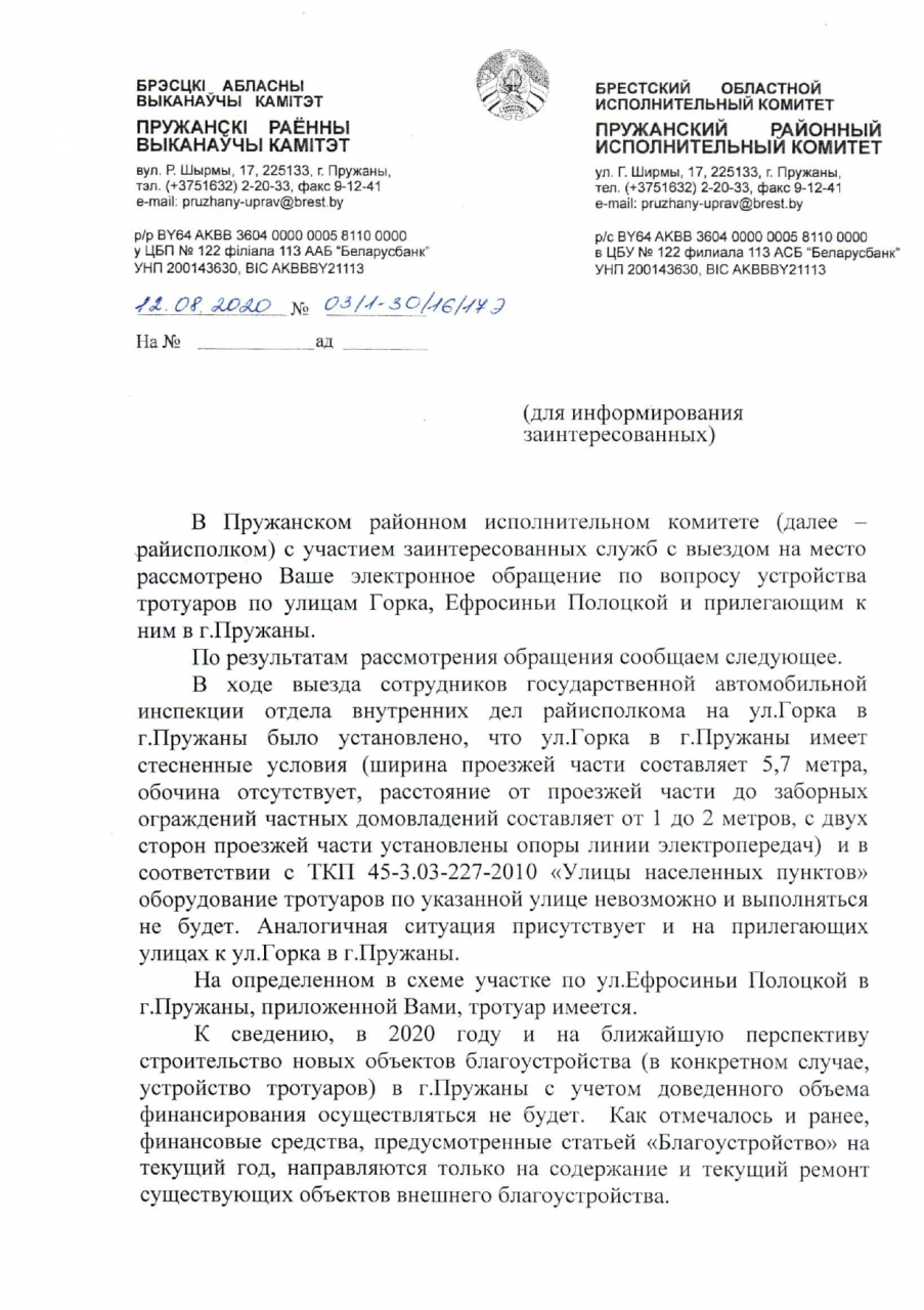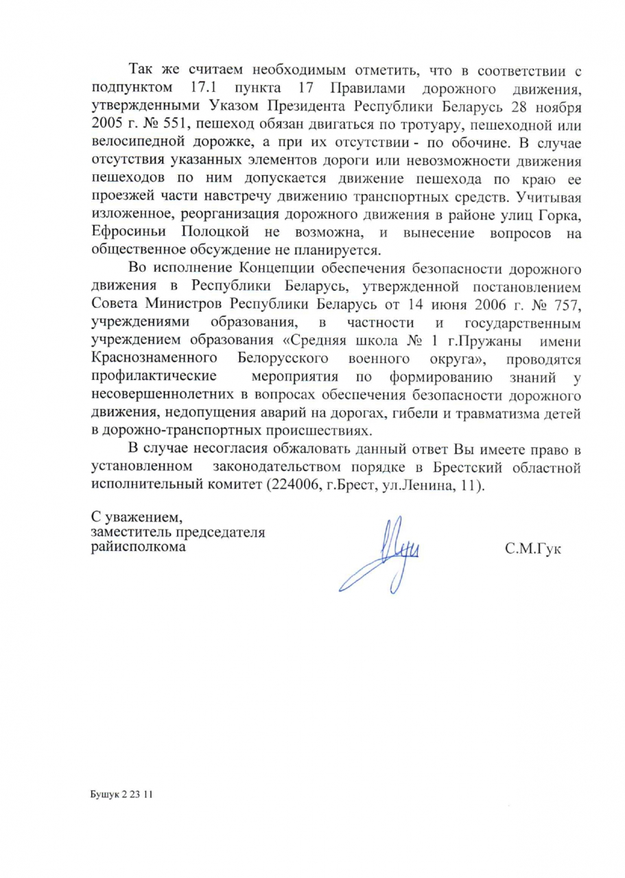Руководствуясь ст.41 Закона "О местном управлении и самоуправлении в Республике Беларусь", устанавливающей, что исполкомы в пределах своей компетенции в порядке, установленном законодательством, организуют строительство, реконструкцию, ремонт и содержание местных автомобильных дорог, а также ст.43 указанного закона, определяющей, что исполкомы базового уровня обеспечивают безопасность дорожного движения и благоустройство соответствующей территории населённого пункта, просим реорганизовать дорожное движение с учётом интересов пешеходов и оборудовать тротуары, обеспечивающие безопасное движение для местных детей, либо предложить в общественном обсуждении с жителями района другое решение.