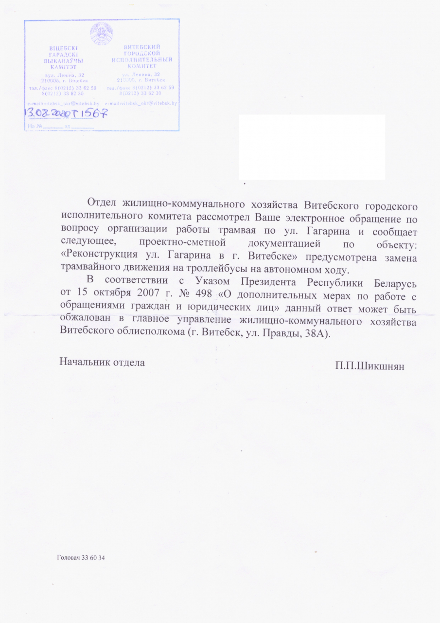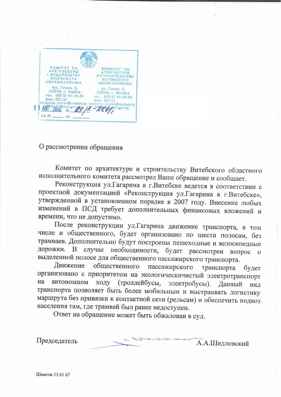 Руководствуясь ст.41 Закона "О местном управлении и самоуправлении в Республике Беларусь", устанавливающей, что исполкомы в пределах своей компетенции в порядке, установленном законодательством, организуют строительство, реконструкцию, ремонт и содержание местных автомобильных дорог, а также создают условия для предоставления транспортных услуг населению и организуют транспортное обслуживание граждан на соответствующей территории, просим пересмотреть решение о расширении проезжей части дороги и прекращении трамвайного движения на проспекте Генерала Людникова и улице Гагарина в городе Витебске и приступить к ремонту трамвайных путей на указанных улицах с последующим обновлением подвижного состава.