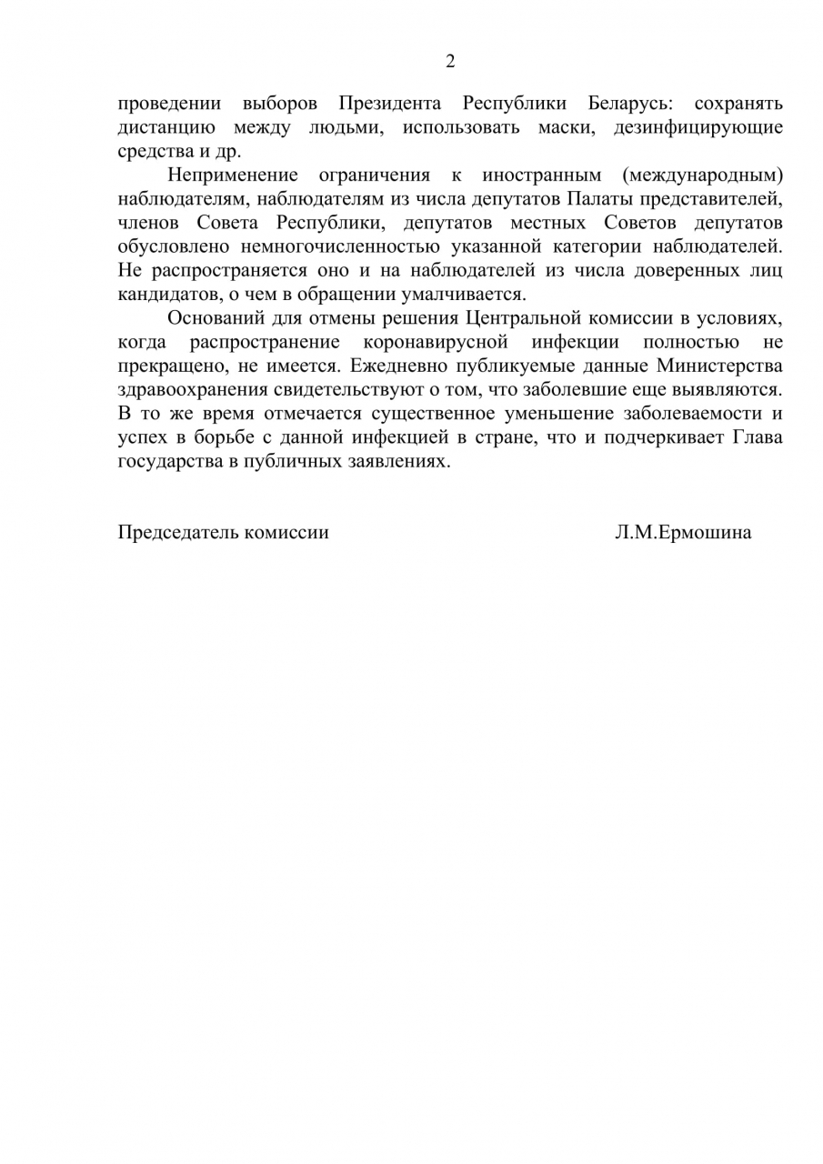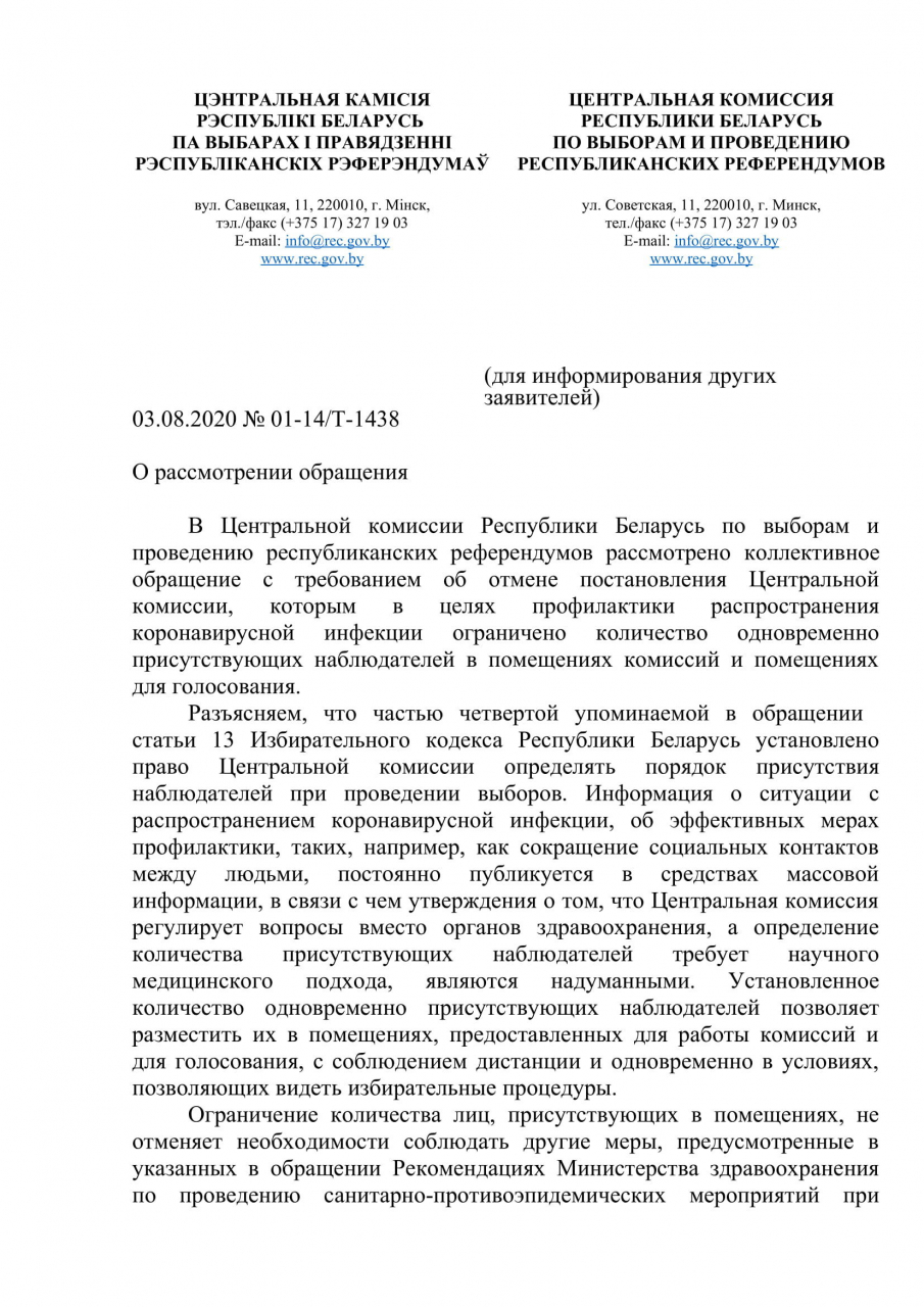 Безусловно, профилактика распространения инфекции в период выборов – чрезвычайно важная задача. Однако ограничение количества наблюдателей не содержится в «Рекомендациях по проведению санитарно-противоэпидемических мероприятий при проведении выборов Президента Республики Беларусь» Министерства здравоохранения, опубликованных на интернет-сайте ЦИК (http://rec.gov.by/sites/default/files/pdf/2020/inf4.pdf).