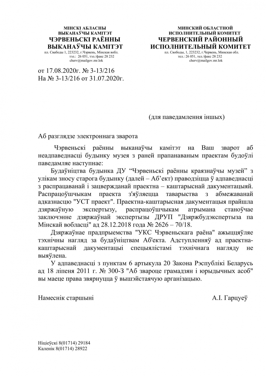 Будаўніцтва будынка ДУ “Чэрвеньскі раённы краязнаўчы музей” з улікам зносу старога будынку праводзіцца ў адпаведнасці з распрацаванай і зацвержданай праектна – каштарыснай дакументацыяй.