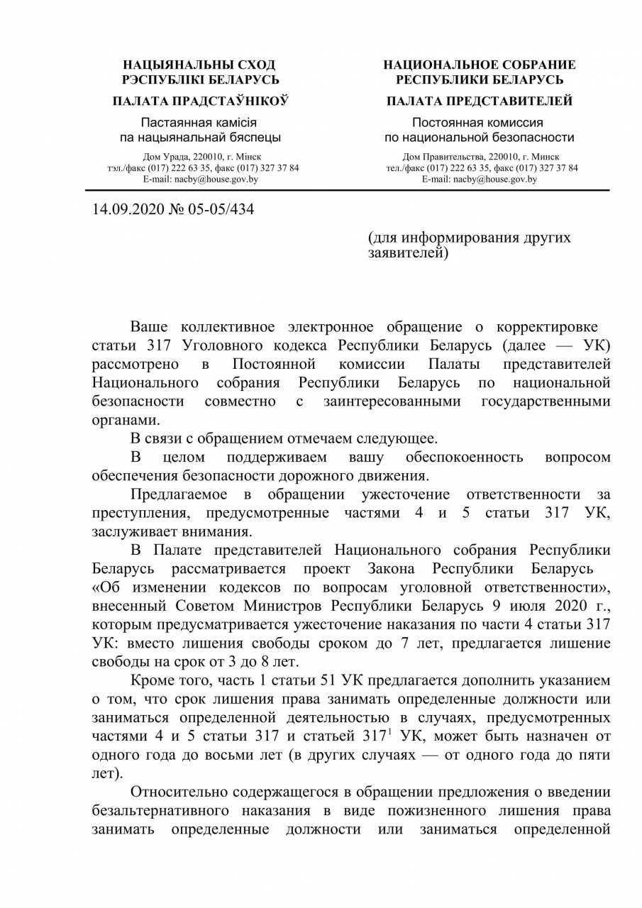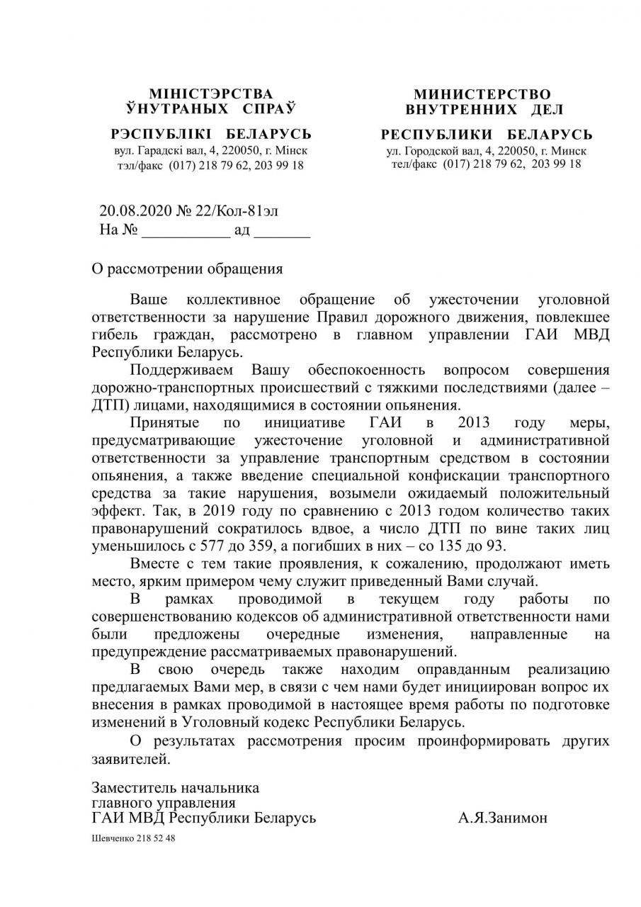 Главным управлением ГАИ МВД Республики Беларусь будет инициирован вопрос внесения предлагаемых в обращении мер в рамках проводимой в настоящее время работы по подготовке изменений в Уголовный кодекс Республики Беларусь.
