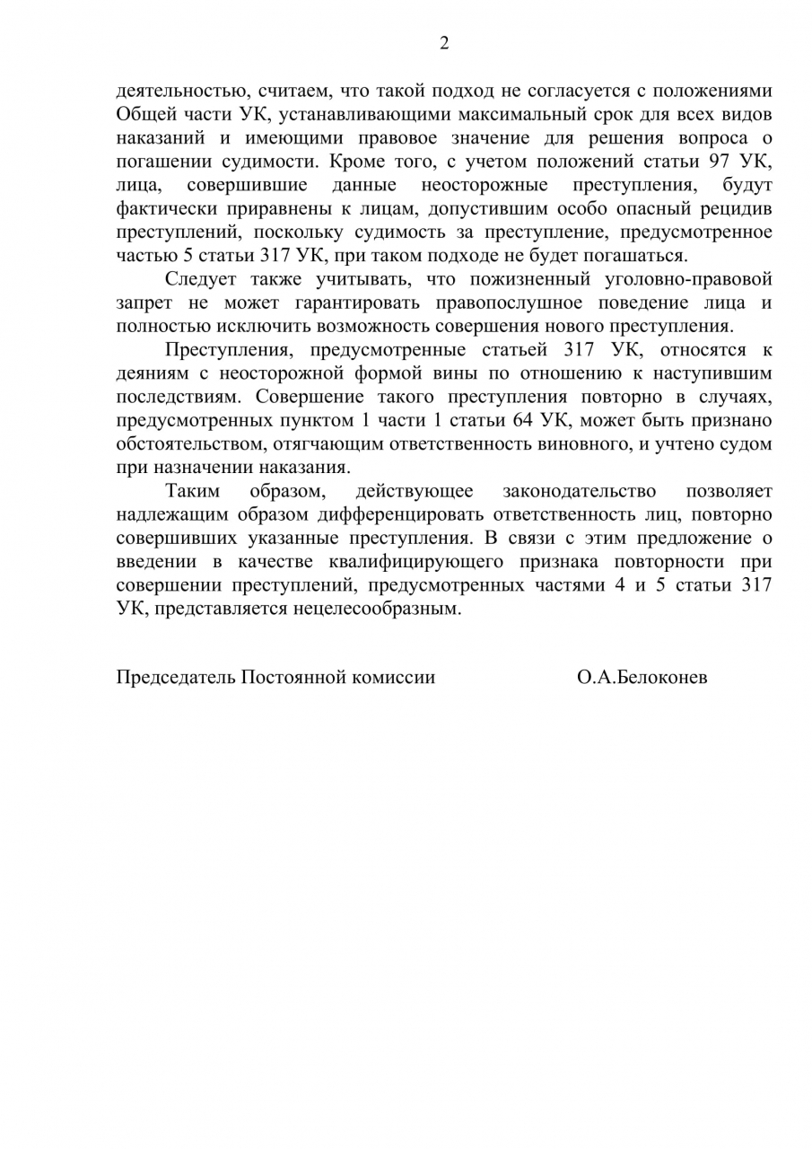 Либо просим добавить пункт в ст.317 Уголовного кодекса следующего содержания: "Повторное деяние, предусмотренное частью 4 и 5 настоящей статьи, – наказывается лишением свободы на срок от пяти до пятнадцати лет с пожизненным лишением права занимать определённые должности или заниматься определенной деятельностью".