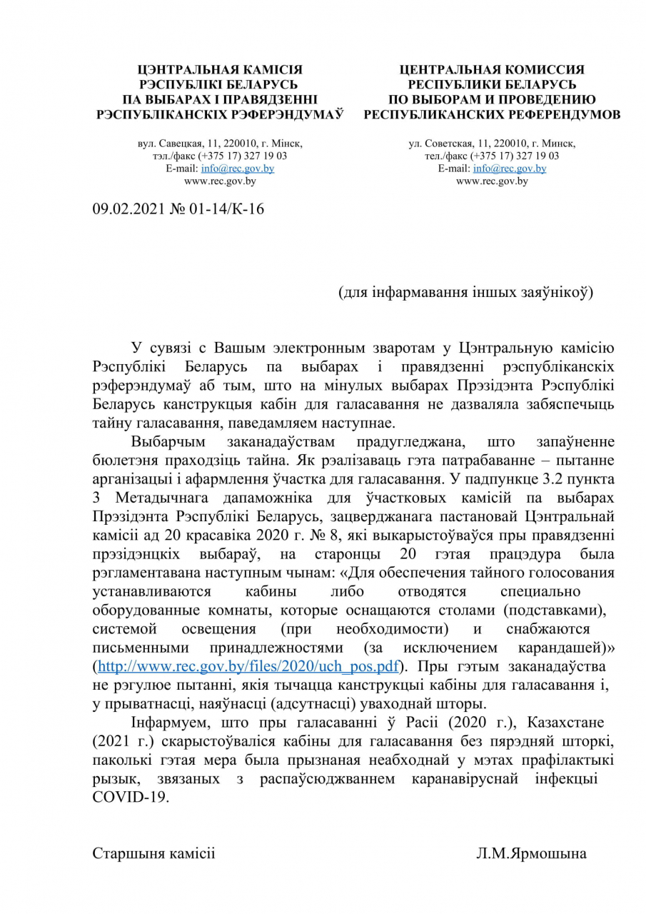 Патрабуем неадкладна абсталяваць фіранкамі кабінкі для галасаваньня па ўсёй тэрыторыі краіны, а таксама забясьпечыць наяўнасьць такіх кабінак у тых выпадках, калі яны фактычна адсутнічаюць.