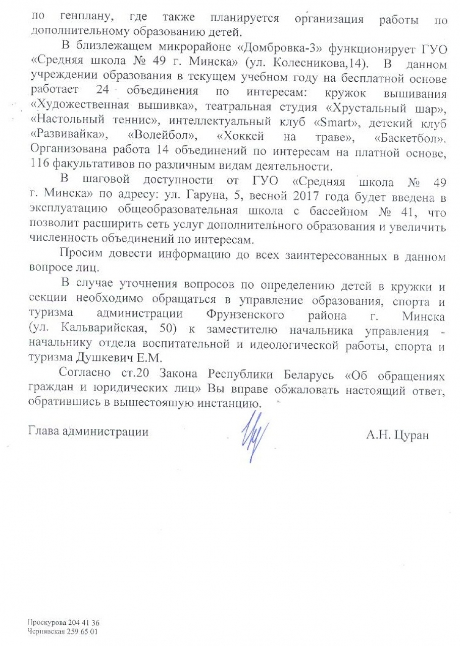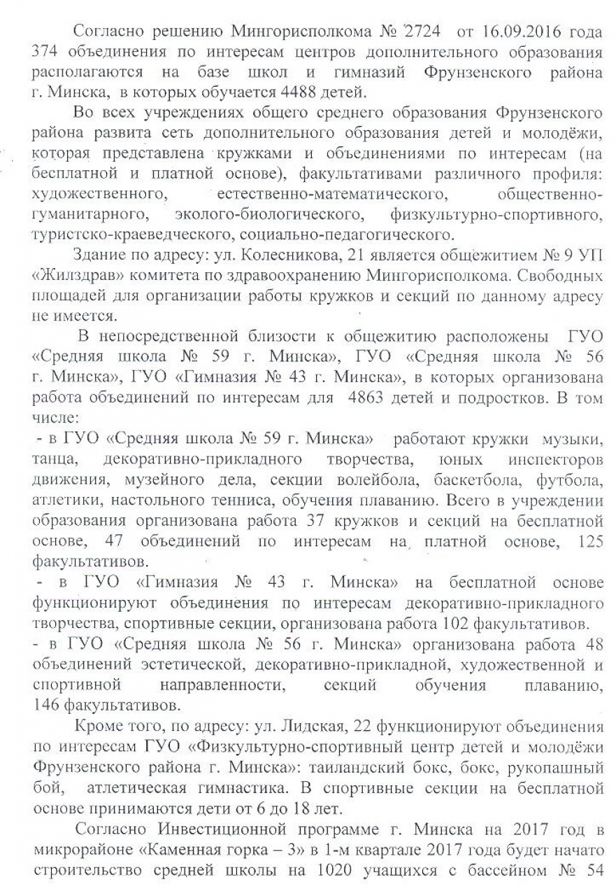 В ответе перечислены функционирующие и запланированные учреждения дополнительного образования в районе, по вопросам определения детей в кружки можно обращаться в управление образования исполкома.