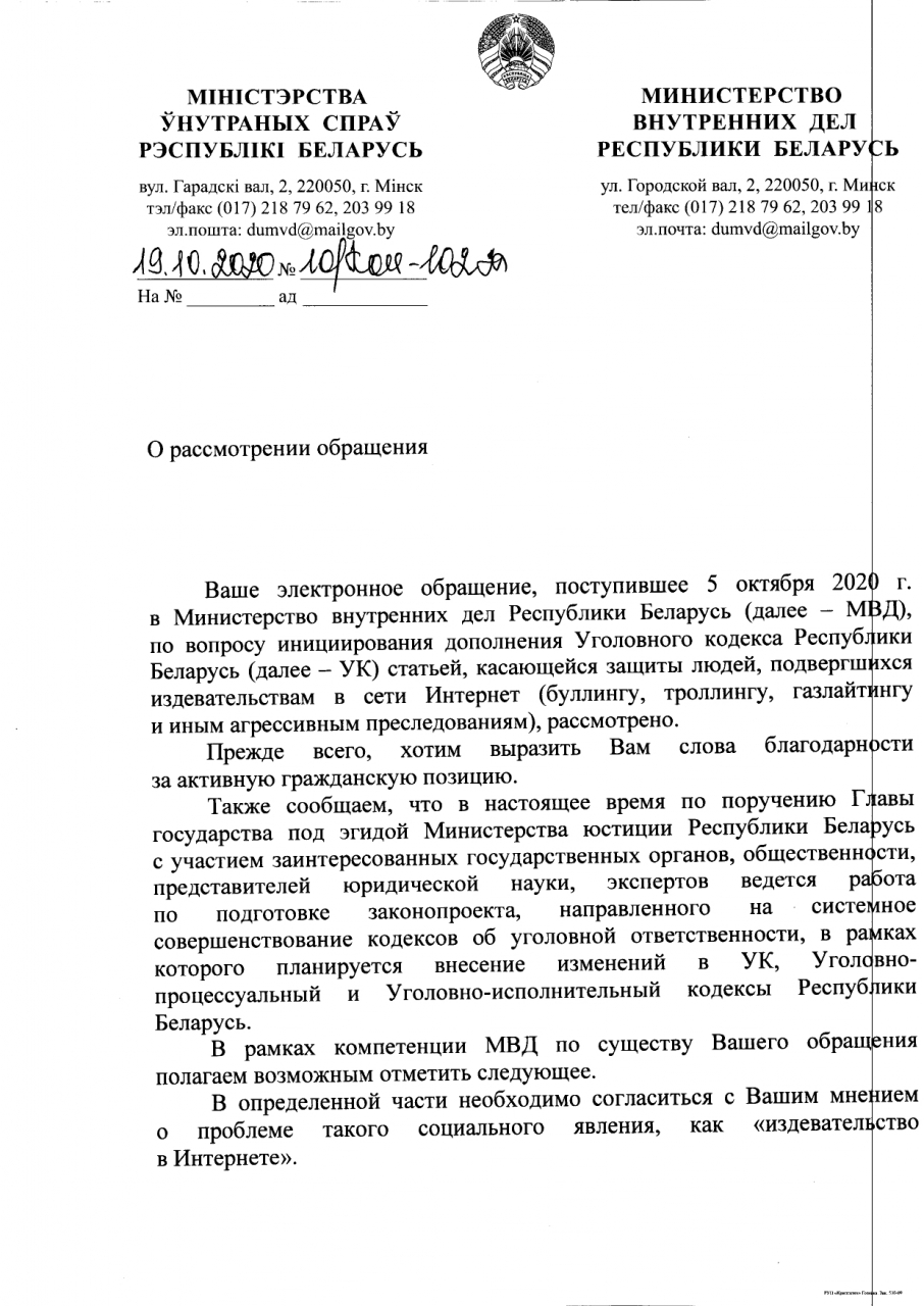Мы, нижеподписавшиеся, предлагаем инициировать внесение в Уголовный кодекс Республики Беларусь статьи, касающейся защиты людей, подвергшихся издевательствам в сети Интернет (буллингу, троллингу, газлайтингу, травле и иным агрессивным преследованиям).