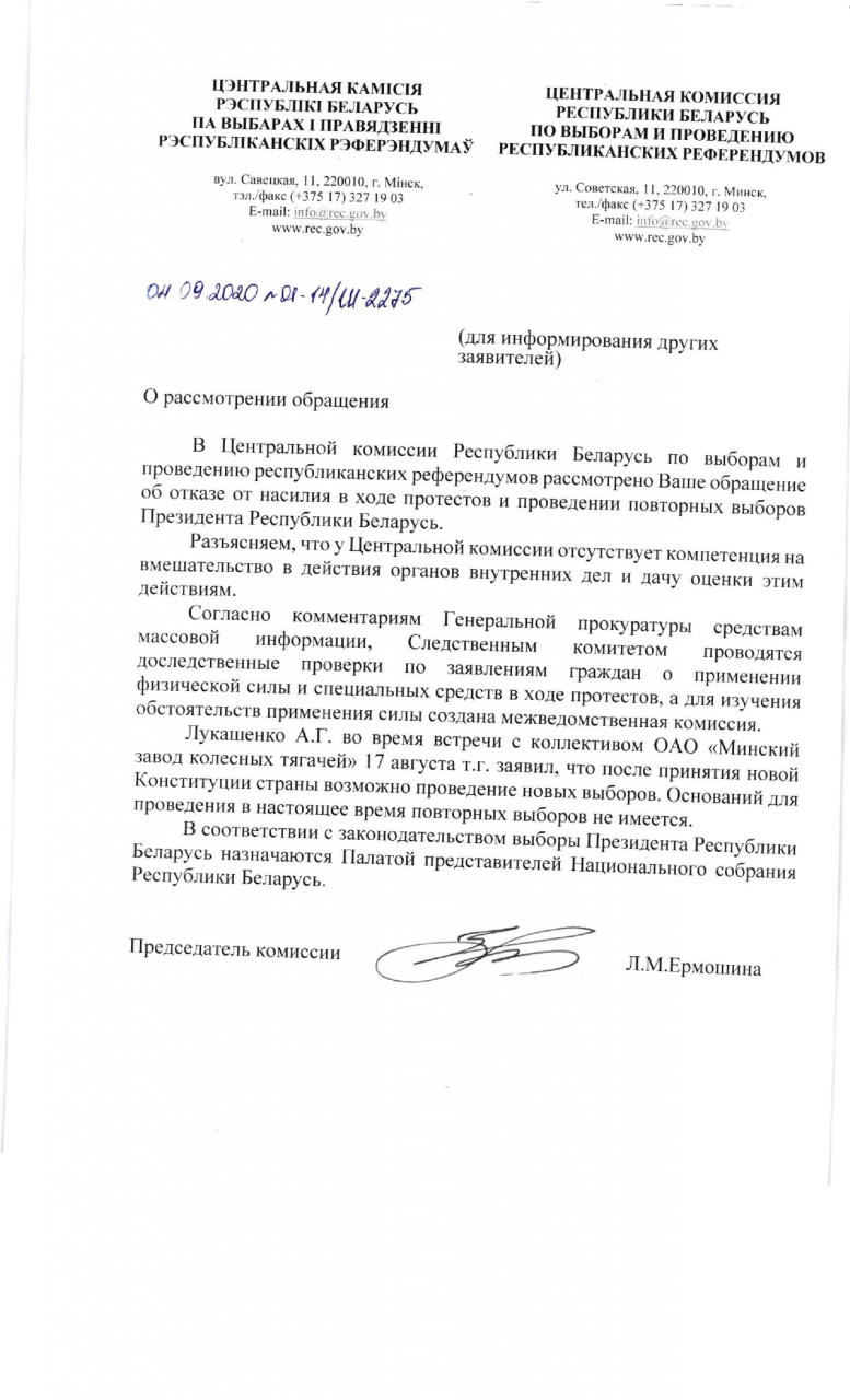 Настоящее обращение направлено на отказ от насилия с обеих сторон в ходе протестов в Республике Беларусь, начавшихся по завершении голосования за Президента страны в 2020 г. , а также имеет своей целью проведение повторных выборах с открытой системой подсчёта голосов.