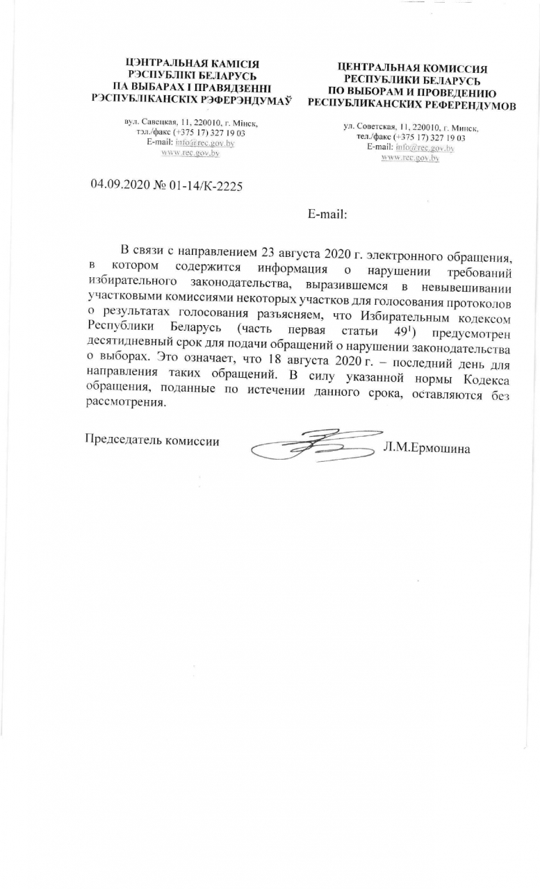 - г.Минск: №1 (Октябрьский р-н); №№1, 2, 3 (Советский р-н); №3 ; №5 (Центральный р-н, Заводской р-н); №6 (Московский р-н, Заводской р-н); №7 (Советский р-н, Центральный р-н, Московский р-н); №8 (Первомайский р-н, Московский р-н); №9 (Советский р-н); №№8,9,10 (Фрунзенский р-н, Советский р-н); №№9-11 (Партизанский р-н); №№11-13 (Советский р-н); №13 (Первомайский р-н, комиссия вывесила копию протокола, однако в ней отсутствовали не только подписи, но и ФИО членов комиссии; Ленинский р-н); №15 (ул.Гая, 34); №№16-17 (Фрунзенский р-н); №17 (Московский р-н); №18 (Ленинский р-н, Фрунзенский р-н); №19 (Фрунзенский р-н, Первомайский р-н); №20 (Фрунзенский р-н, Центральный р-н); №23 (общ. ОАО УКХ "ГОРИЗОНТ", Фрунзенский р-н, ул.Захарова, 58); №24 (ул.Захарова, 58); №№24-25 (Партизанский р-н, Фрунзенский р-н, Центральный р-н); №25 (ул.Антоновская); №27 (Партизанский р-н); №29 (Первомайский р-н); №30 (СШ №142); №31 (Партизанский р-н); №32 и №33; №33 (ГУО "Ордена Трудового Красного Знамени #50", Партизанский р-н, Московского р-на); №34 (Московский р-н); №35; №№37, 36, 38, 39, 40 (Фрунзенский р-н); №40 (Ленинский р-н); №41 (Советский р-н, Фрунзенский р-н); №43 (Фрунзенский р-н); №44 (Фрунзенский р-н); №№45-46 (Первомайский р-н); №№49, 50, 51 (Московский р-н); №50 (Центральный р-н); №51 (ул.Радужная, 8, к.3); №№54-55 (Первомайский р-н); №60, №62, №63 (Московский р-н); №64 (СШ №25); №65 (Фрунзенский р-н, Ленинский р-н - не подписана председателем комиссии; Советский р-н); №66-67 (Фрунзенский р-н); №№67-68 (Московский р-н); №69; №73 (Фрунзенский р-н); №№74-76 (СШ №218); №75 (Фрунзенский р-н); №76 (ул.Есенина,13); №78 (Московский р-н); №80 (Фрунзенский р-н); №80-81 (Заводской р-н); №№81, 82, 83, 84, 85 (Московский р-н); №86 (ул.Бельского, 59, ул. Янки Мавра, 10); №№87-88 (ул. Янки Мавра, 10), №91 (пр.Любимова, 31); №92 (Фрунзенский р-н); №№99-100 (Московский р-н); №№101-103 (ул.Есенина, 101); №№104-105 (СШ №16), №106, №№104-106 (Московский р-н) №109, №110 (гимназия №32); №114 (Фрунзенский р-н); №№118, 119, 120 (Фрунзенский р-н).