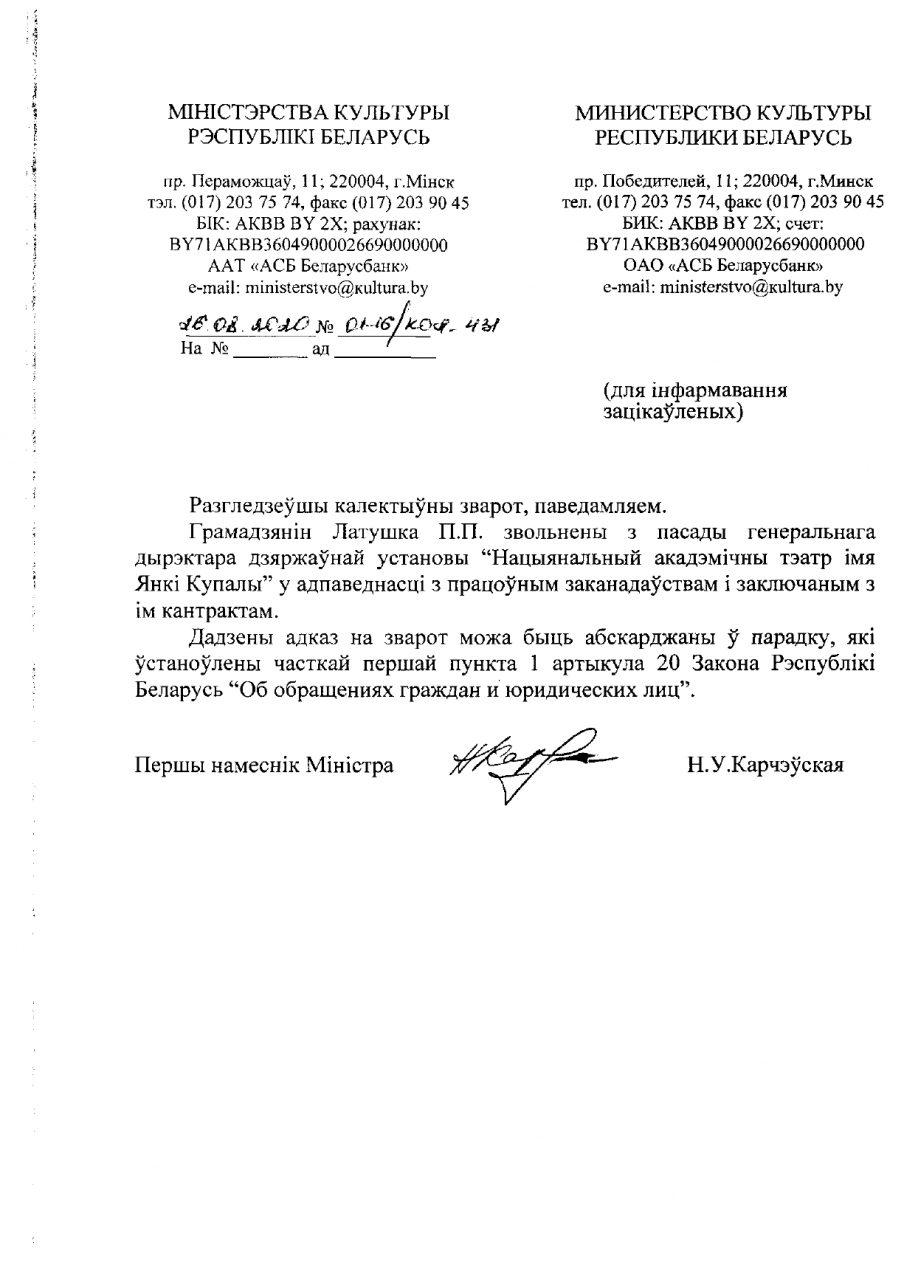 Грамадзянін Латушка П.П. звольнены з пасады гендырэктара ДУ "Нацыянальны акадэмічны тэатр ім.Янкі Купалы" у адпаведнасці з працоўным заканадаўствам і заключаным з ім кантрактам.
