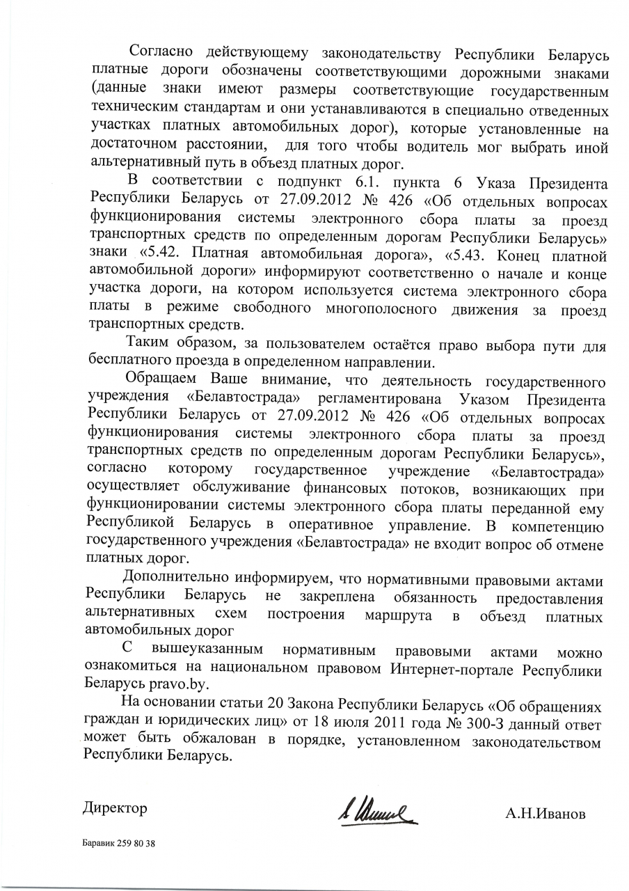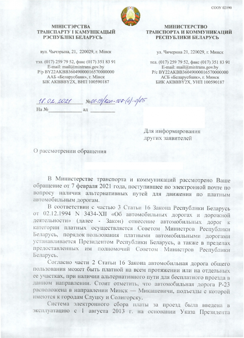 Настоящим обращением просим рассмотреть вопрос об отмене платных дорог, при отсутствии бесплатных дорог в одном направлении, для транспорта, принадлежащего гражданам Беларуси, массой свыше 3.5 тонн.