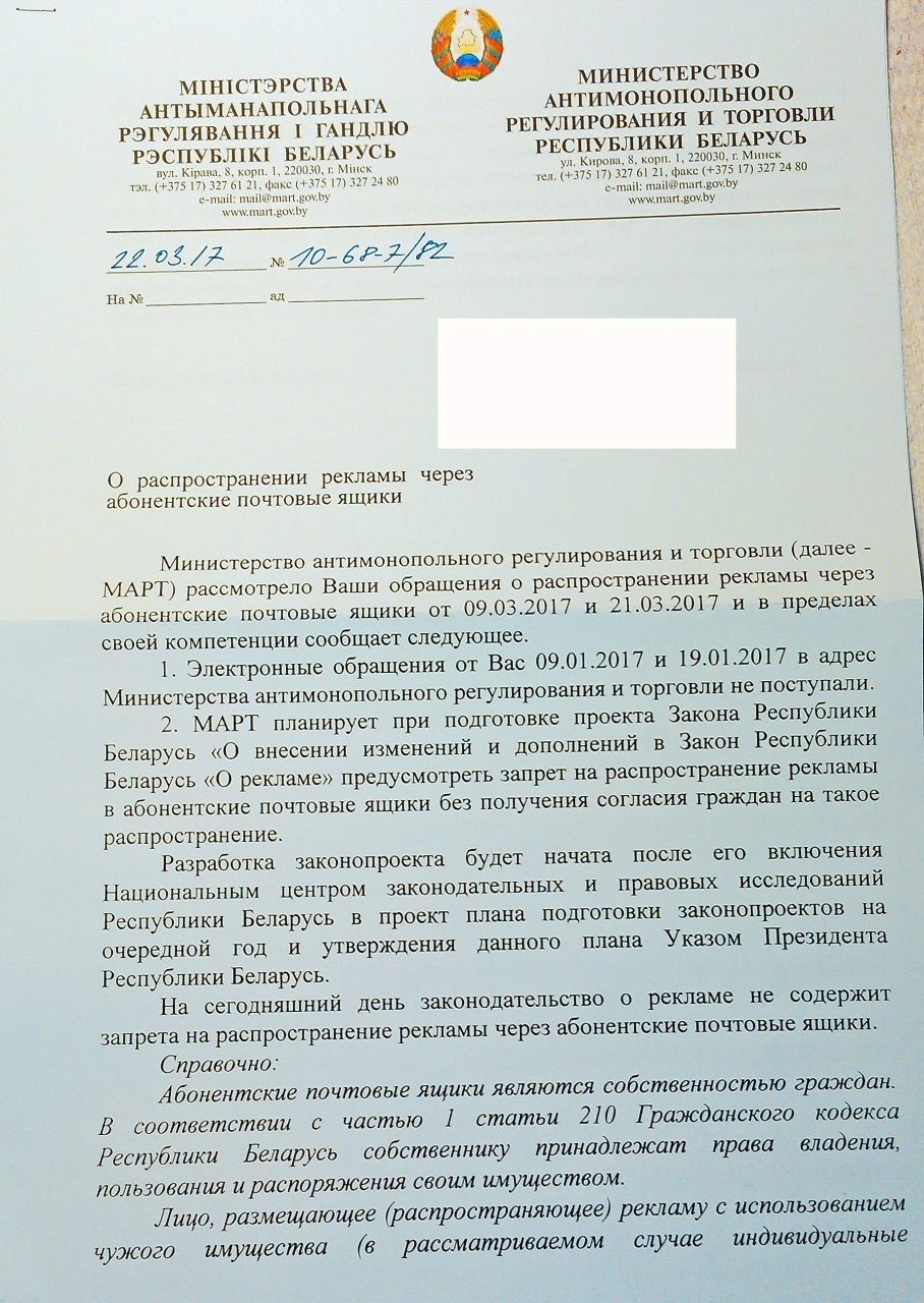 Государственные органы выступали с инициативой внесения изменений в Закон "О рекламе" норм о доставке рекламных материалов только работниками почты, но эта норма не прошла согласования.