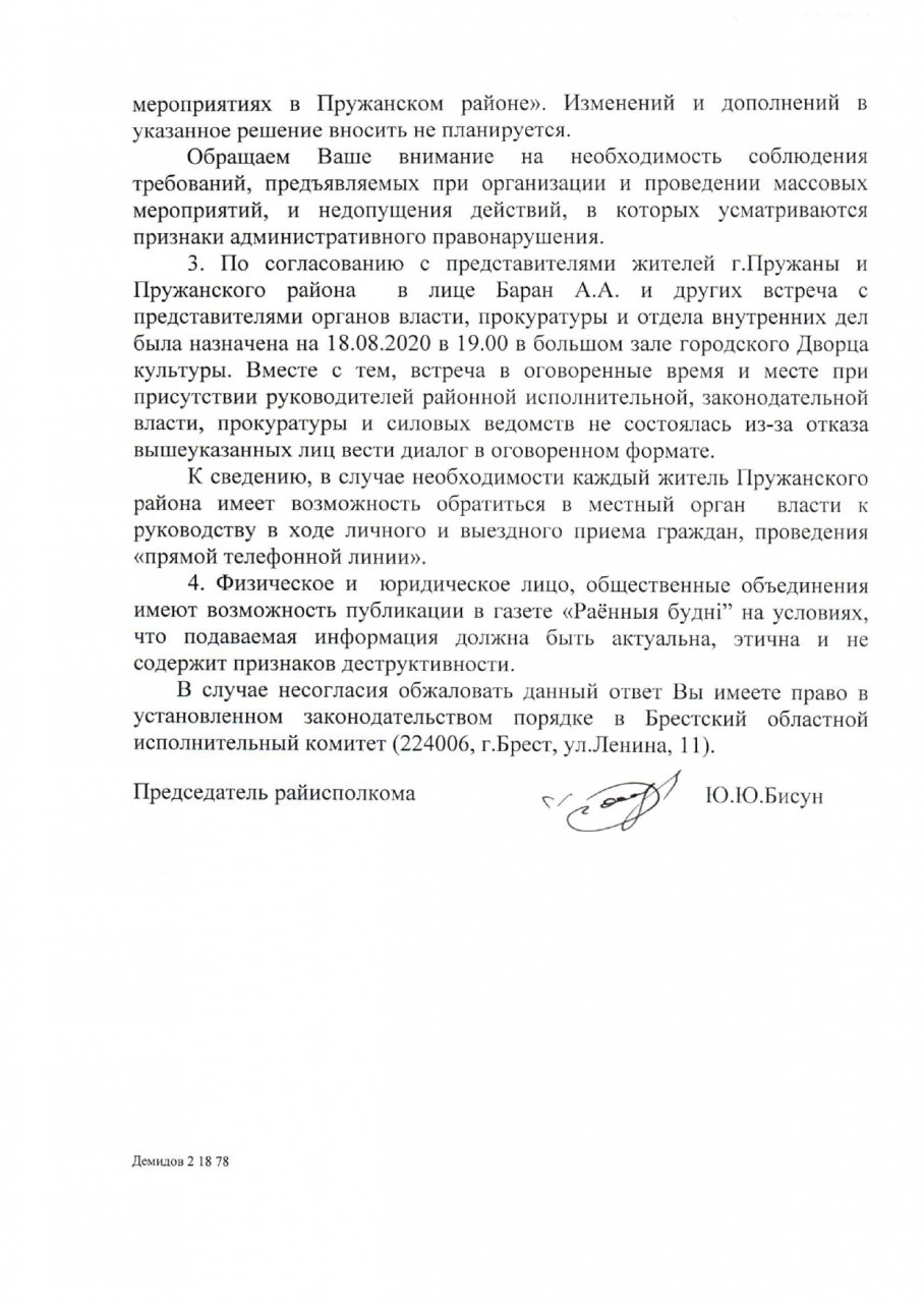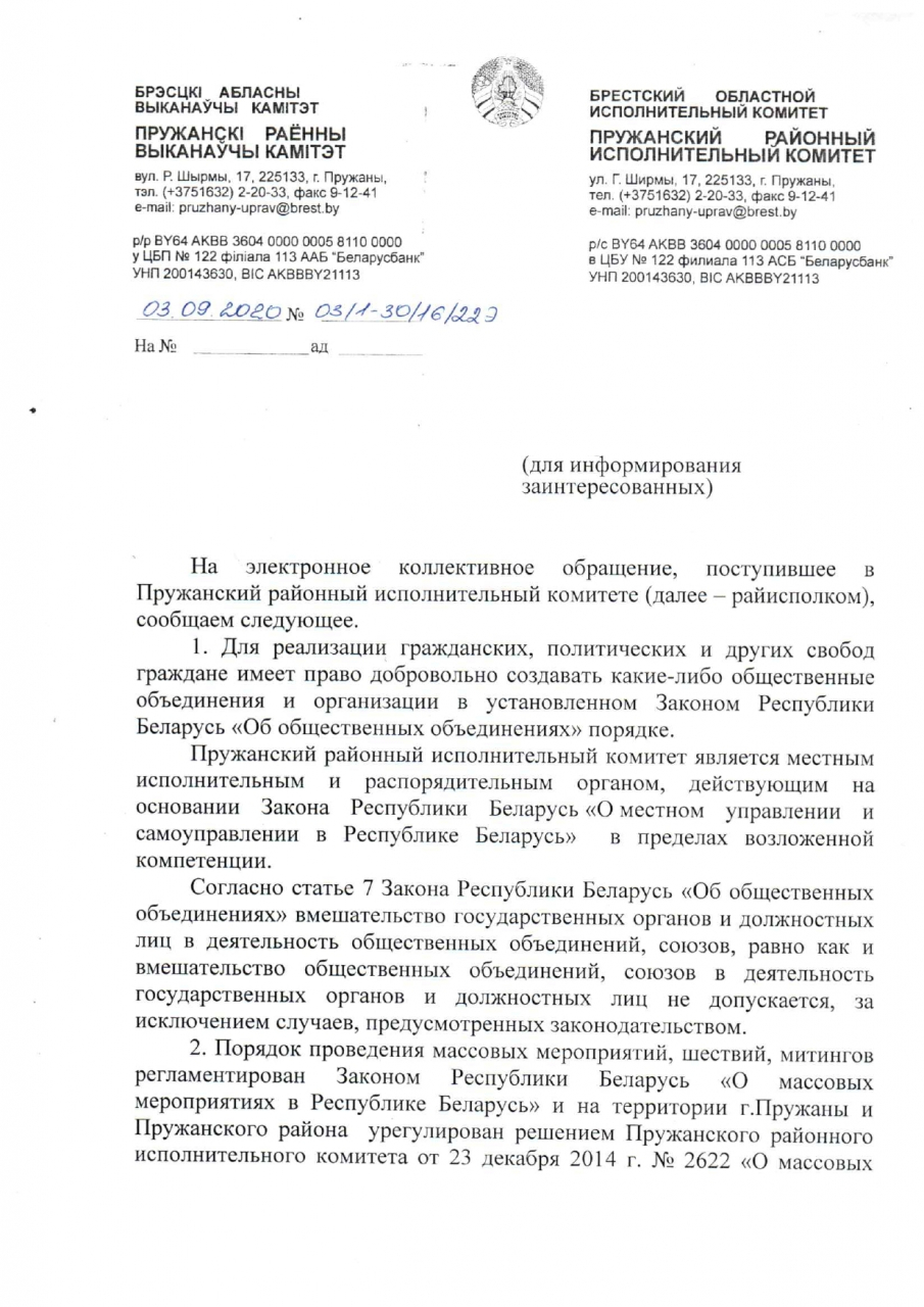 Вмешательство госорганов в деятельнонсоть общественных объединений, равно как и вмешательство общественных объединений в деятельность госорганов не допускается. Порядок проведения массовых мероприятий, шествий, митингов регламентирован законодательством. Встреча с представителями органов власти, назначенная на 18 августа, не состоялась из-за отказа вести диалог в оговоренном формате. Публикации в газете "Раённыя будні" должны быть актуальны, этичны и не содержать признаков деструктивности.