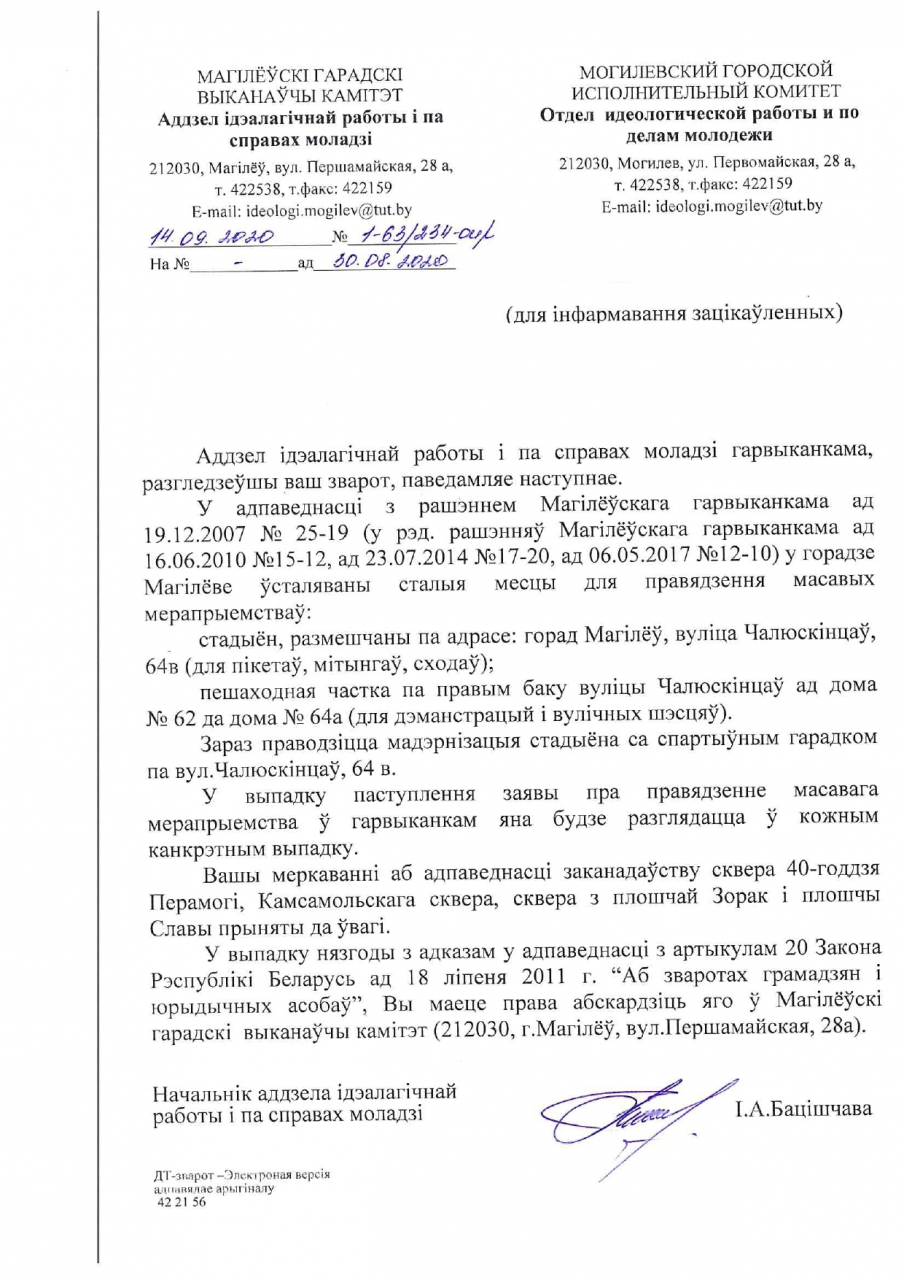 У выпадку паступлення заявы пра правядзенне масавага мерапрыемства ў гарвыканкам, яна будзе разглядацца ў канкрэтным выпадку. Меркаванні аб адпаведнасці заканадаўству сквера 40-годдзя Перамогі, Камсамольскога скверу і іншых месцаў, пералічаных у звароце, прыняты да ўвагі.