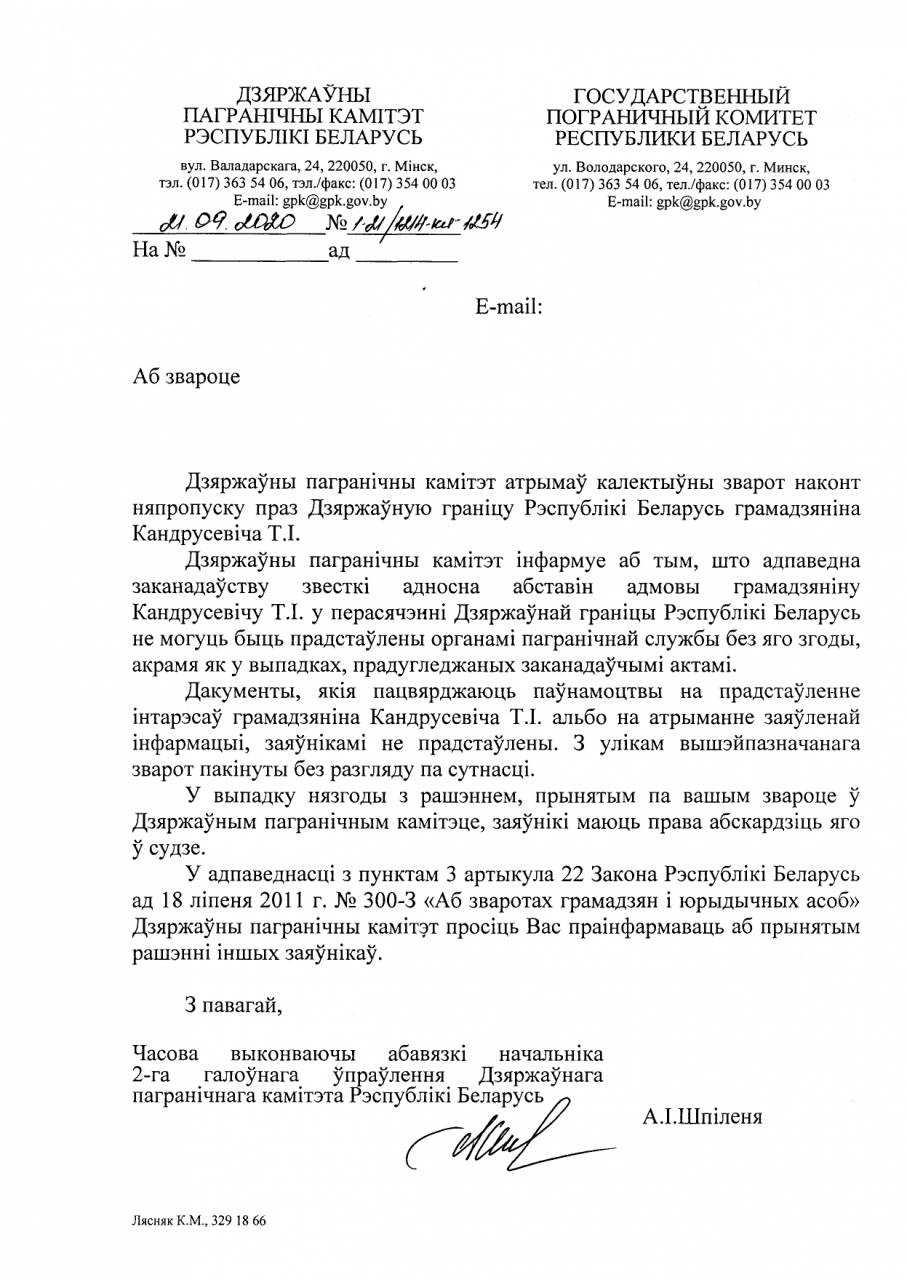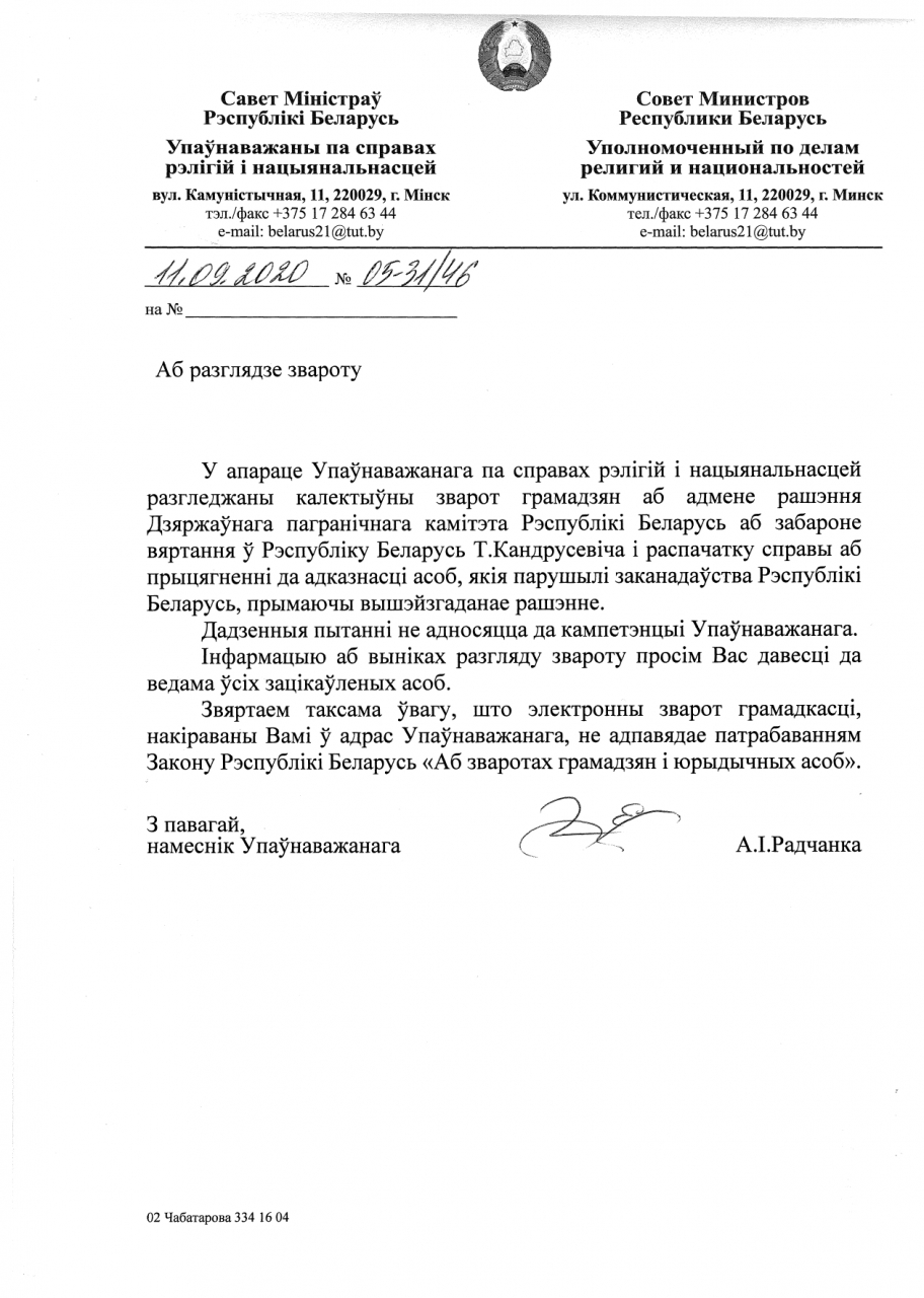 Пытанні аб адмене рашэння ДТК аб забароне вяртання ў Рэспубліку Беларусь Т.Кандрусевіча і распачатку справы аб прыцягненні да адказнасці асоб, якія парушылі заканадаўства Рэспублікі Беларусь, прымаючы вышэйзгаданае рашэнне, не адносяцца да кампетэнцыі Упаўнаважанага па справах рэлігій і нацыянальнасцей.