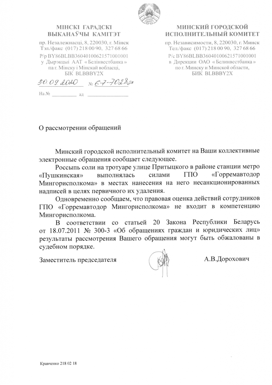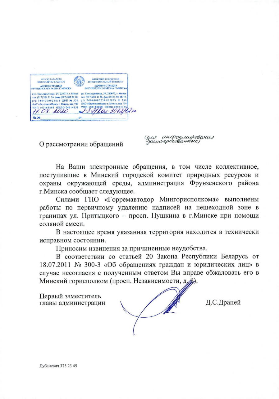Силами ГПО "Горремавтодор Мингорисполкома" выполнены работы по первичному удалению надписей на пешеходной зоне в границах ул.Притыцкого- пр-т Пушкина при помощи соляной смеси. В настоящее время указанная территория находится в технически исправном состоянии.