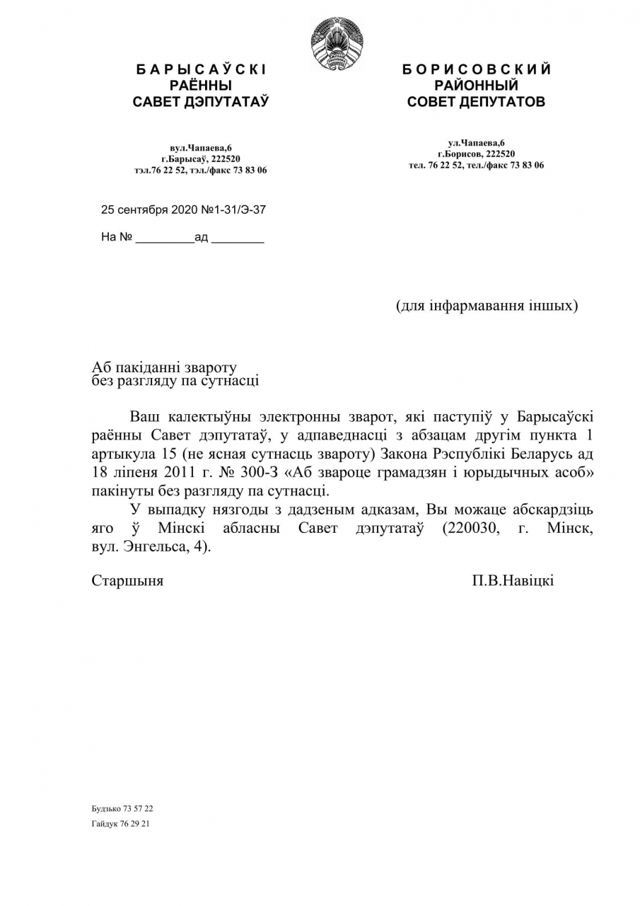Калектыўны электронны зварот пакінуты без разгляду па сутнасці (не ясная сутнасць звароту).