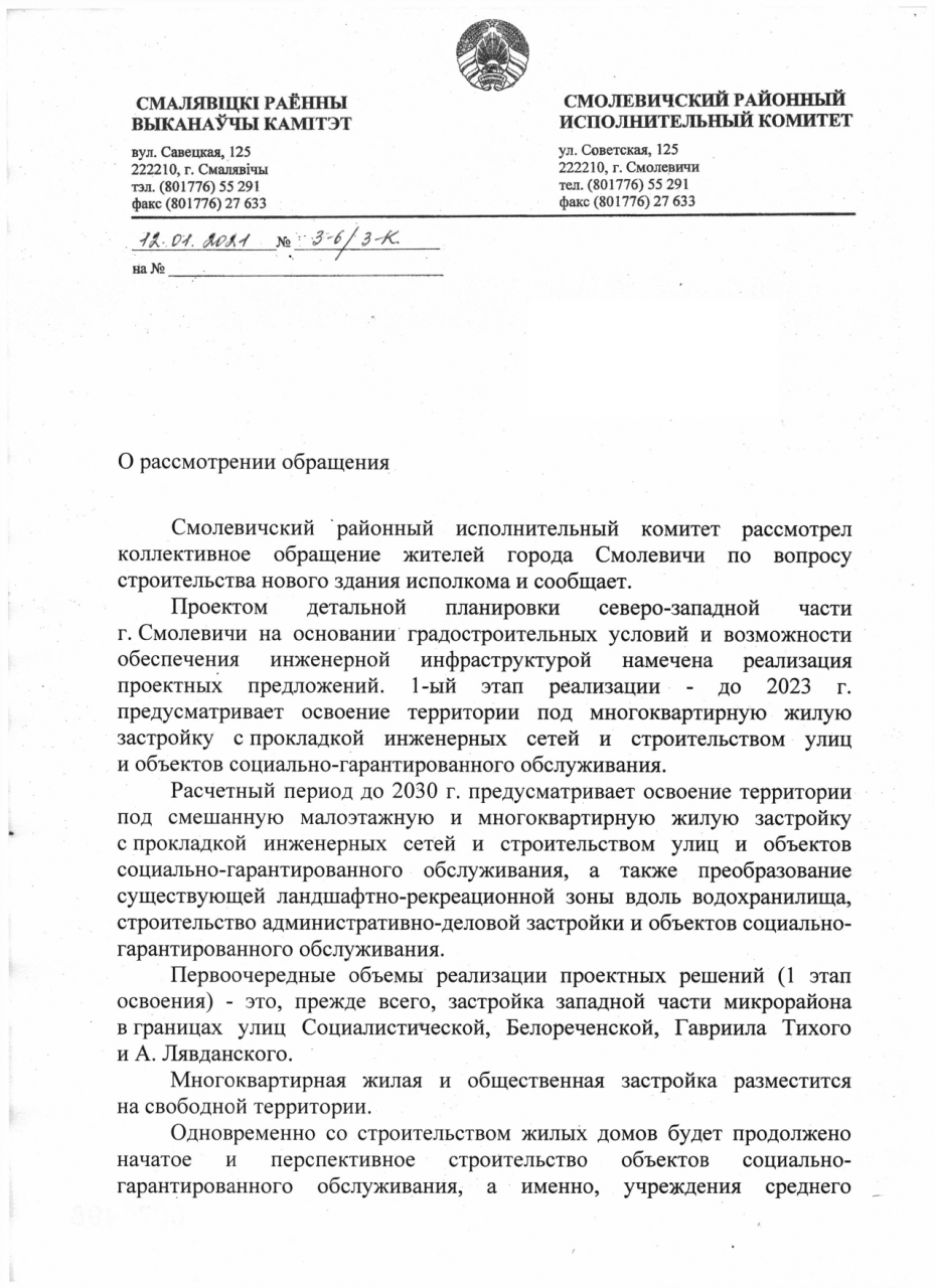 При презентации детального плана застройки северо-западной части города Смолевичи в марте 2020 нам стало известно о строительстве нового административного здания для нужд райисполкома.