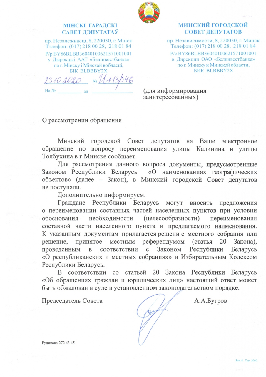 Для рассмотрения вопроса, изложенного в обращении, документы, предусмотренные Законом "О наименованиях географических объектов" (обоснование необходимости (целесообразности) переименования, решение местного собрания или референдума), в Минский городской Совет депутатов не поступали.