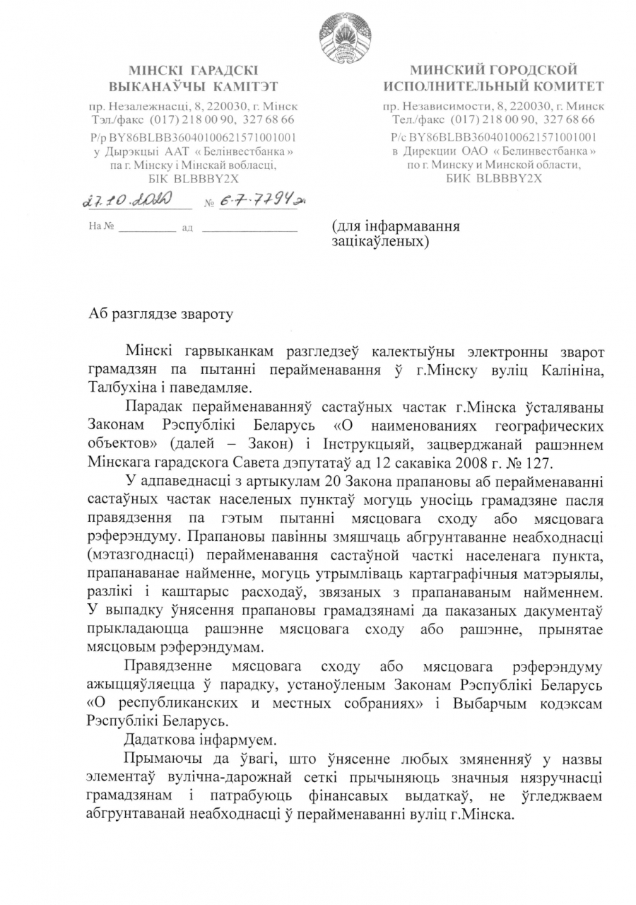 Мы, госці і жыхары г.Мінска, у тым ліку сталічных вуліцы Калініна і вуліцы Талбухіна, а таксама прылеглых да іх кварталаў,