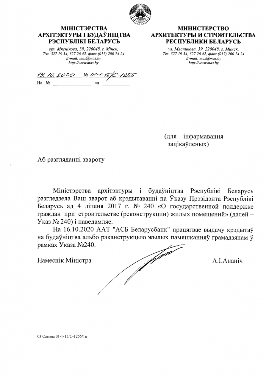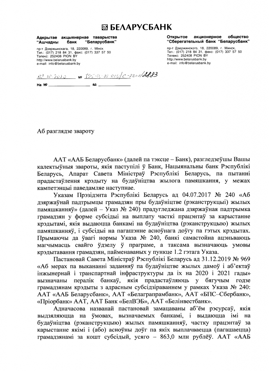 На 16.10.2020 ААТ "АСБ Беларусбанк" працягвае выдачу крэдытаў на будаўніцтва альбо рэканструкцыю жылых памяшканняў грамадзянам у рамках Указа №240 «Аб дзяржаўнай падтрымцы грамадзян пры будаўніцтве (рэканструкцыі) жылых памяшканняў».