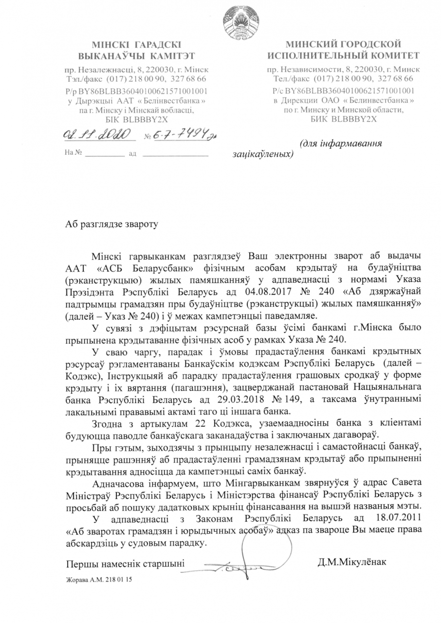 Мінгарвыканкам звярнуўся ў адрас Савета Міністраў і Міністэрства фінансаў з просьбай аб пошуку дадатковых крыніц фінансавання на прадстаўлення крэдытаў у рамках Указа №240 "Аб дзяржаўнай падтрымцы грамадзян пры будаўніцтве (рэканструкцыі) жылых памяшканняў".