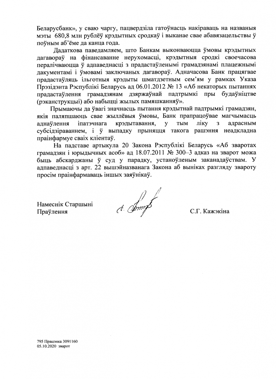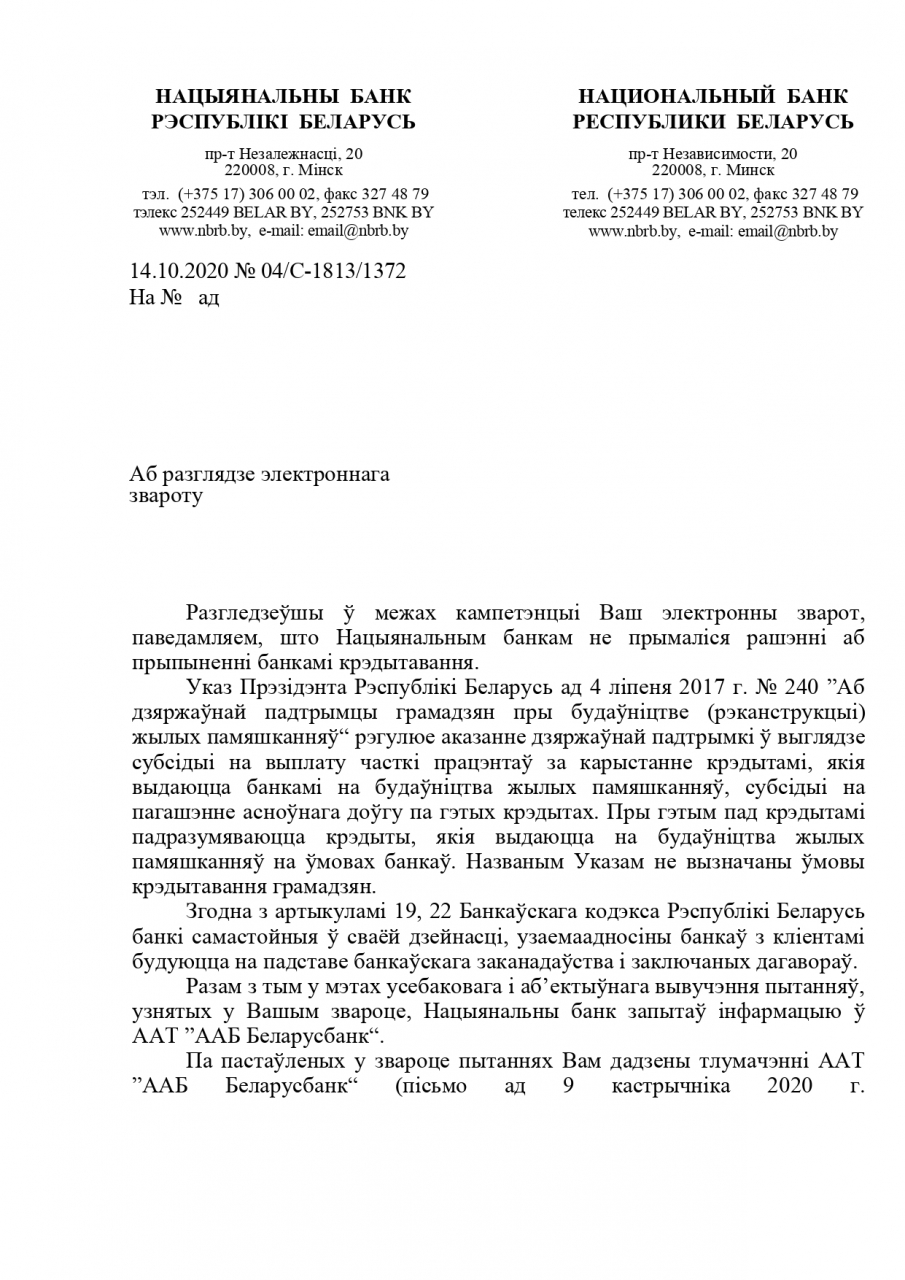 Нацбанк запытаў інфармацыю ў ААТ "ААБ Беларусбанк", па пастаўленых у звароце пытаннях заяўнікам дадзены тлумачэнні ААТ "ААБ Беларусбанк" (пісьмо ад 09.10.2020 №795-13-02-013/С-2808/2883).