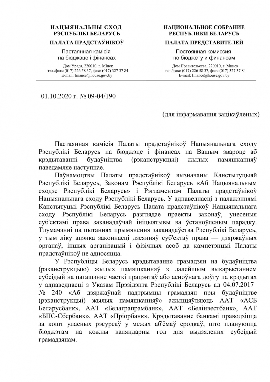 На сённяшні дзень ААТ «АСБ Беларусбанк» часова прыпыніў прыём заяў на выдачу новых крэдытаў на будаўніцтва (рэканструкцыю) жылля, пры гэтым фінансаванне па раней заключаных дагаворах ажыццяўляецца своечасова і ў поўным аб'ёме. У цяперашні час банкам сумесна з зацікаўленымі дзяржаўнымі органамі праводзіцца работа па аднаўленні заключэння новых крэдытных дагавораў і фінансавання на ўказаныя мэты.