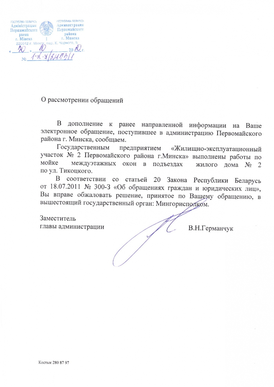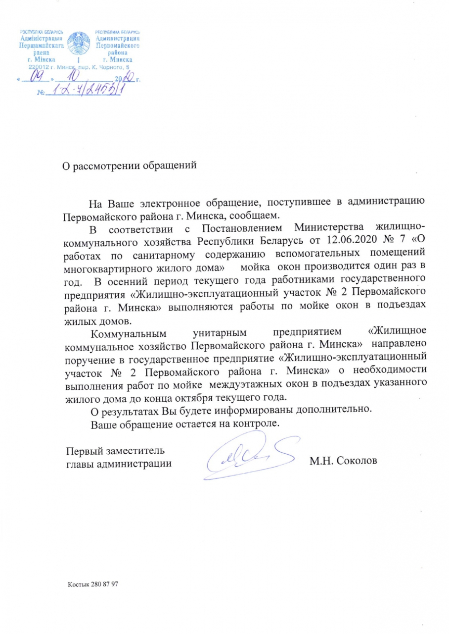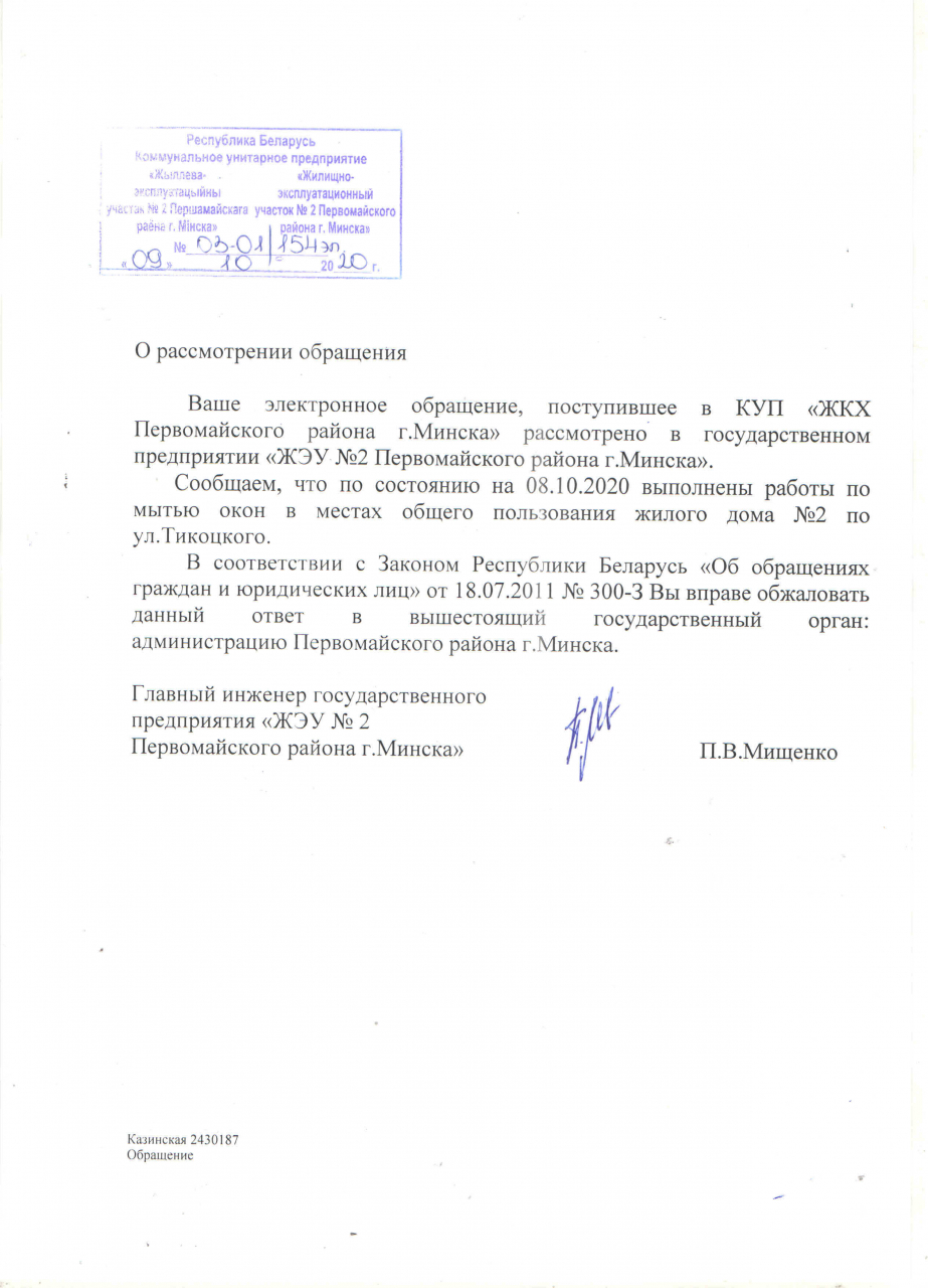 УП "ЖКХ Первомайского района г.Минска" направлено поручение в ГП "ЖЭУ №2 Первомайского района г.Минска" о необходимости выполнения работ по мойке междуэтажных окон в подъездах указанного в обращении жилого дома до конца октября текущего года.