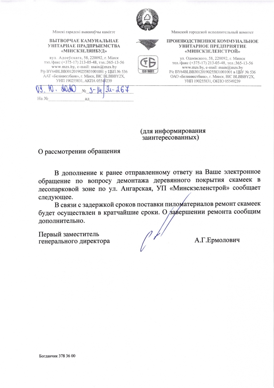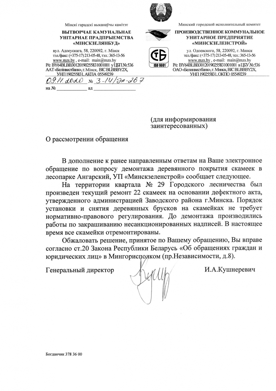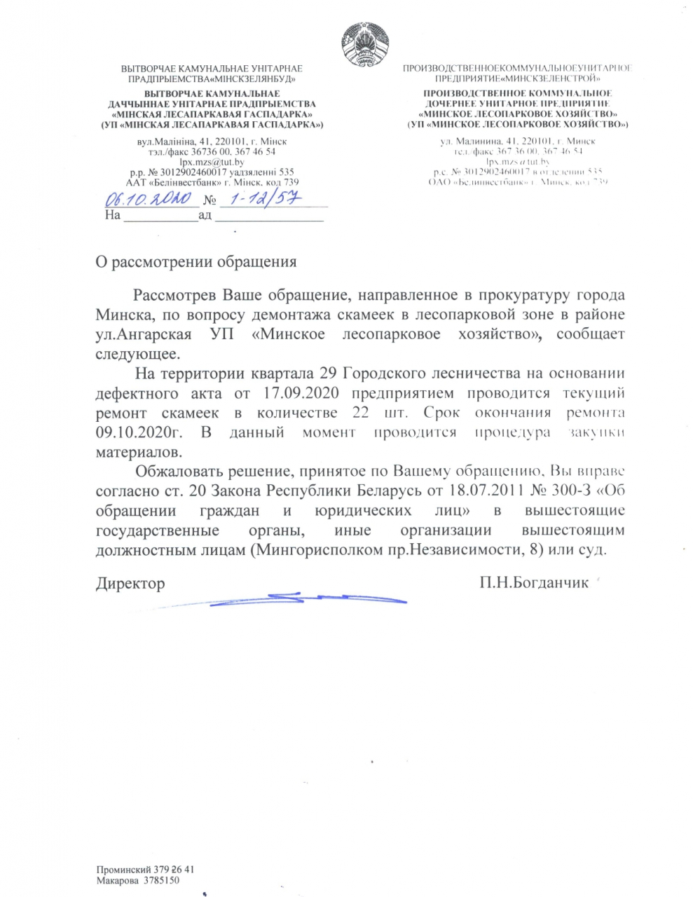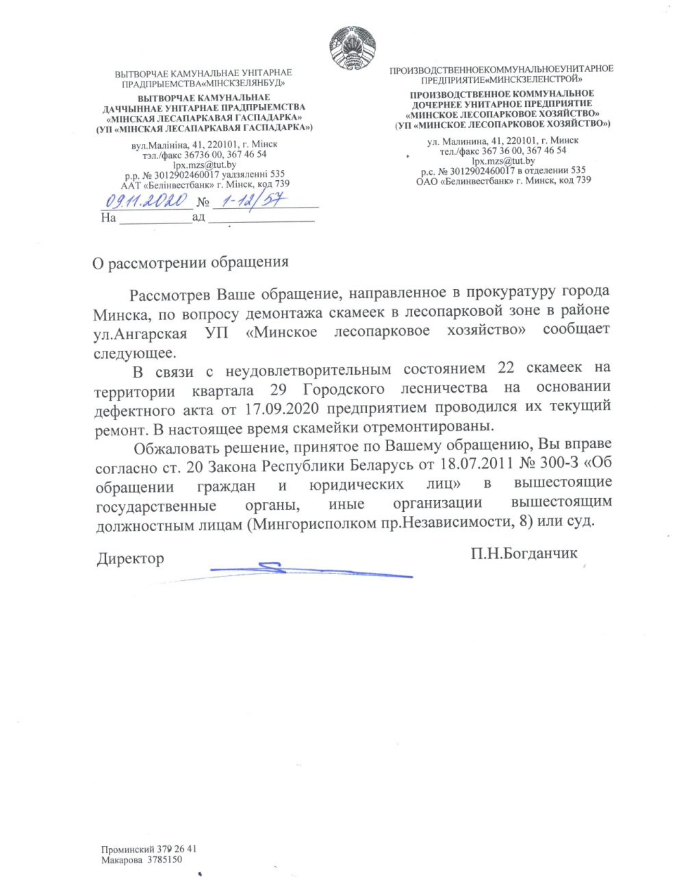 - дать правовую оценку вышеописанным действиям работников УП “Минское лесопарковое хозяйство” и в случае установления фактов правонарушения привлечь к установленной законом ответственности виновных лиц, в случае установления фактов неправомерного демонтажа исправных скамеек и нецелевого использования бюджетных средств, кроме прочего, на покраску неисправных скамеек до ремонта.