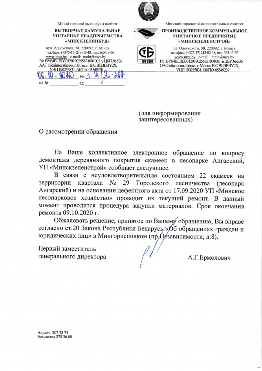 Мы, нижеподписавшиеся граждане Республики Беларусь, доводим до вашего сведения, что 20 сентября 2020 г. УП “Минское лесопарковое хозяйство” демонтировало скамейки из лесопарка "Ангарская-2" (далее - Лесопарк). Скамейки демонтированы под предлогом ремонта, но при этом визуально они находились в удовлетворительном состоянии и недавно были покрашены. Фото скамеек до и после демонтажа прилагается.