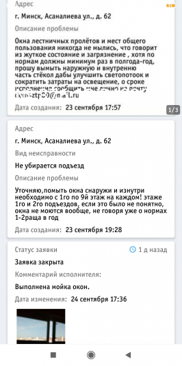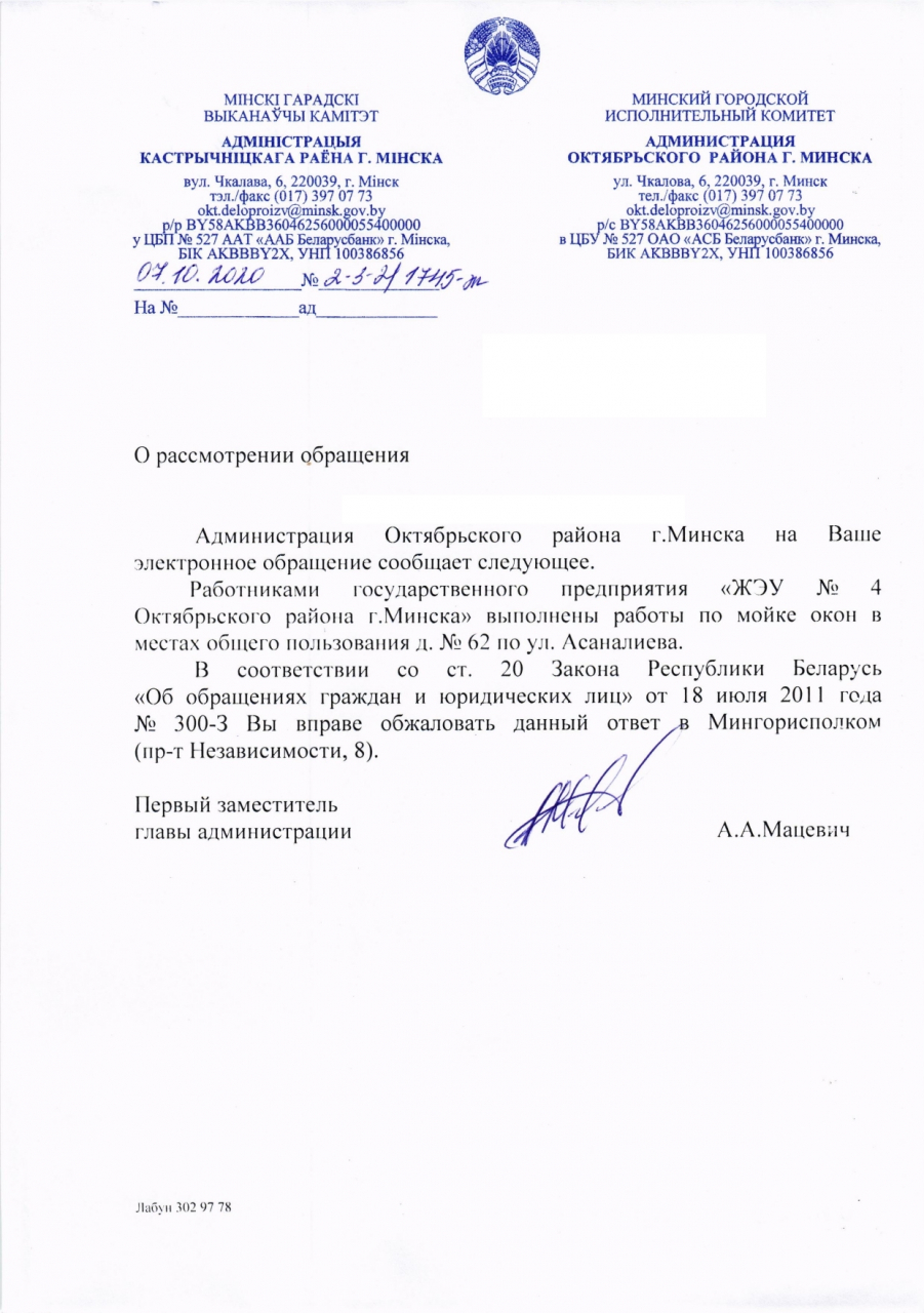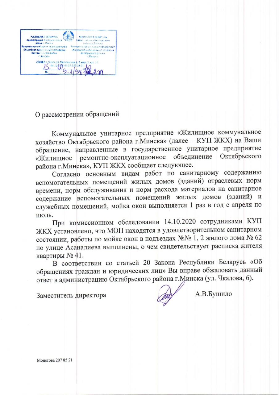 КУП "ЖКХ Октябрьского района г.Минска" 14.10.2020 установлено, что работы по мойке окон в подъездах №1, №2 дома №62 на ул.Асаналиева выполнены, о чём свидетельствует расписка одного из местных жителей.
