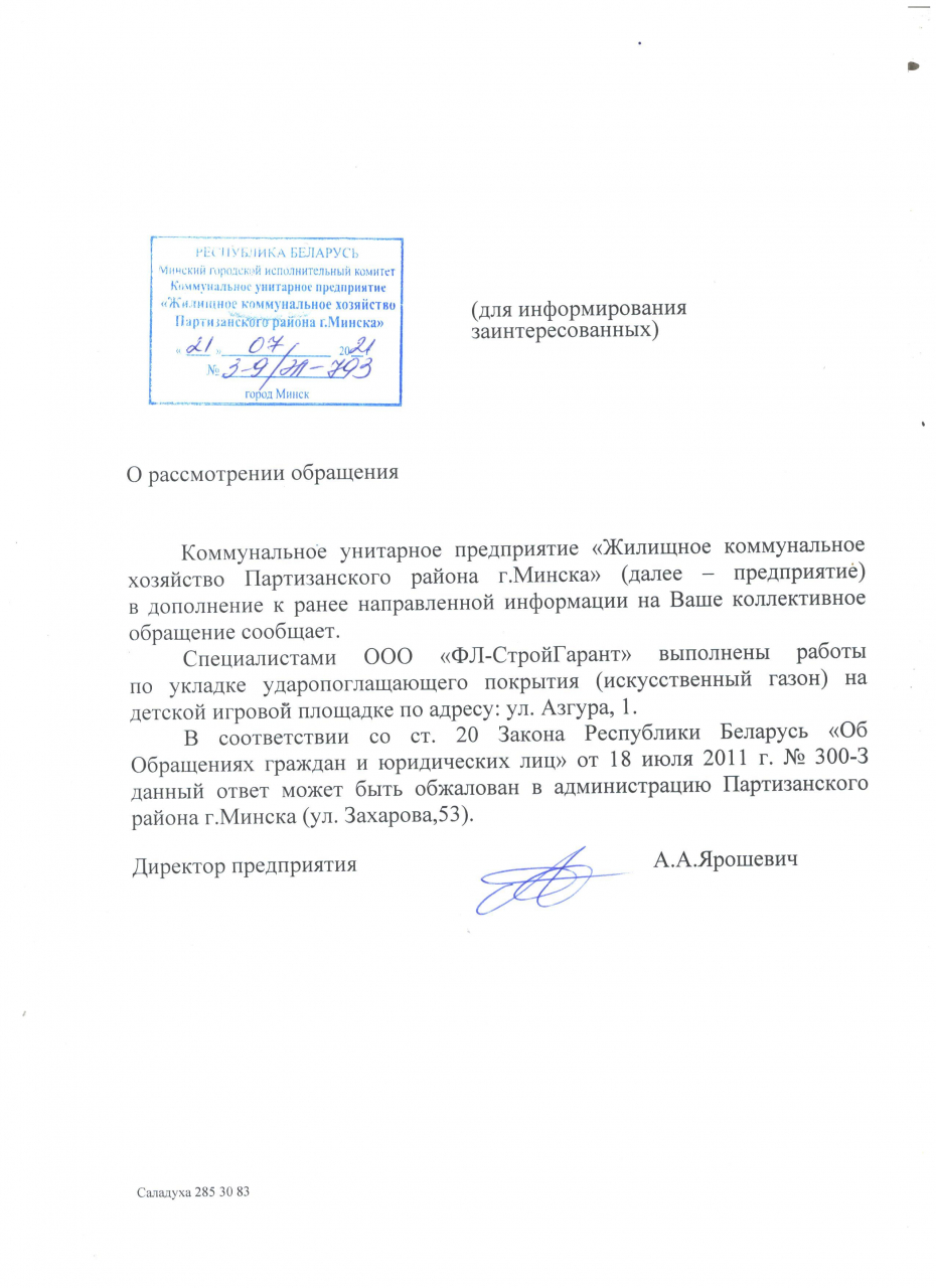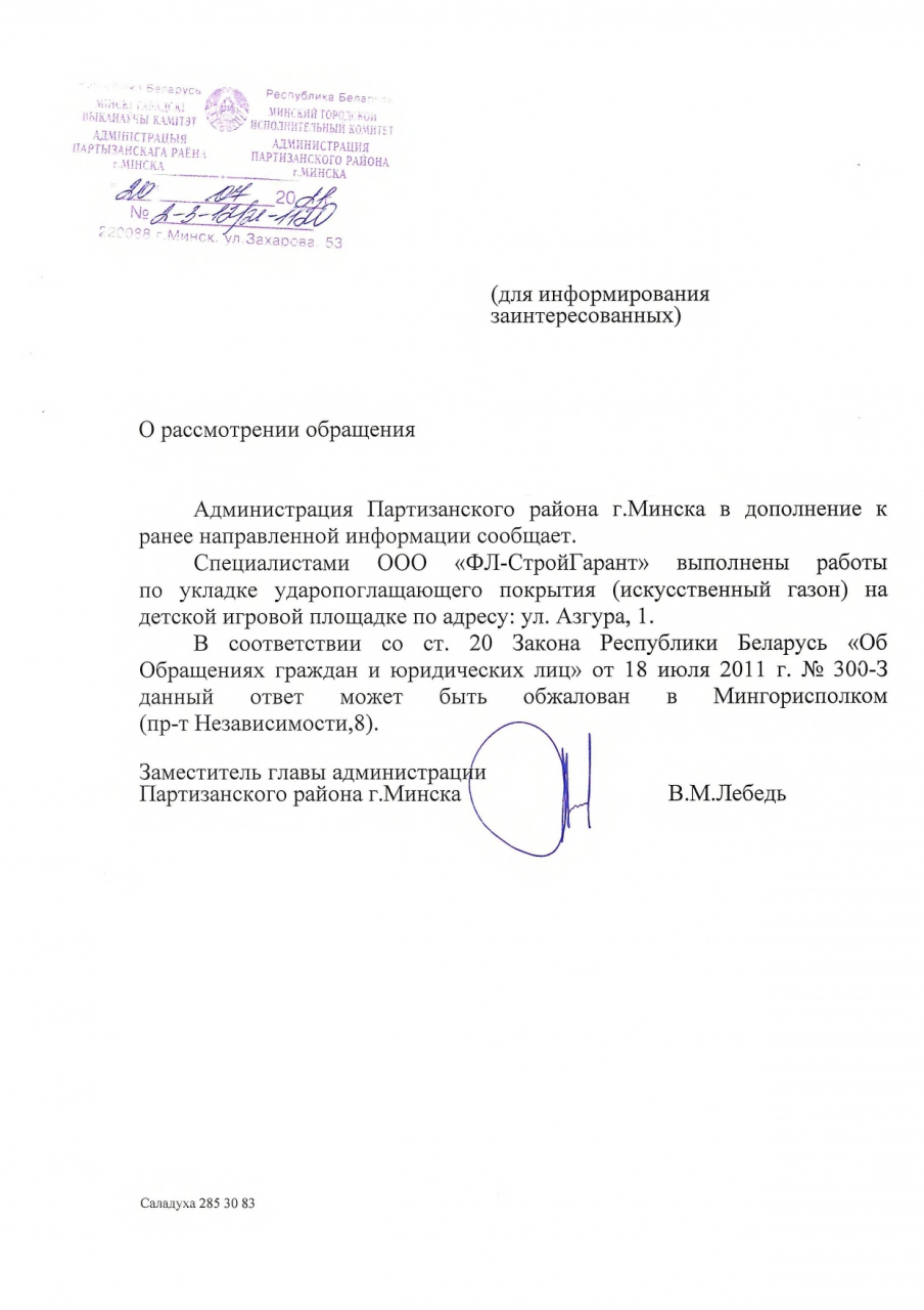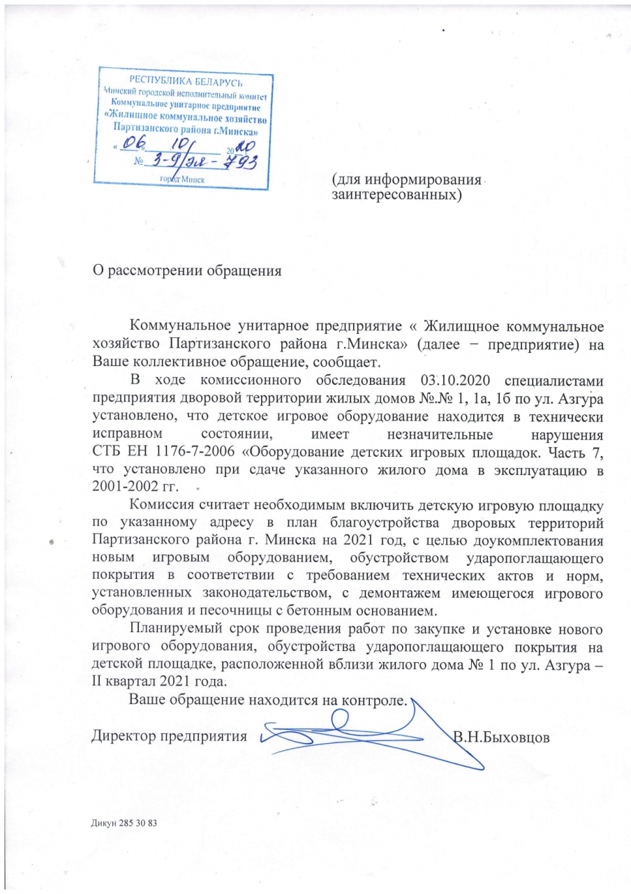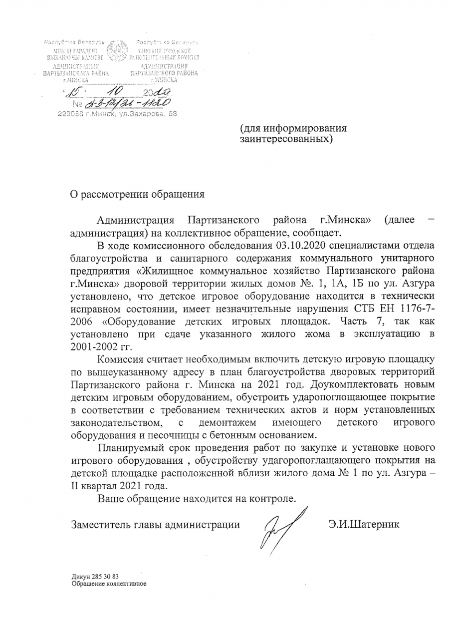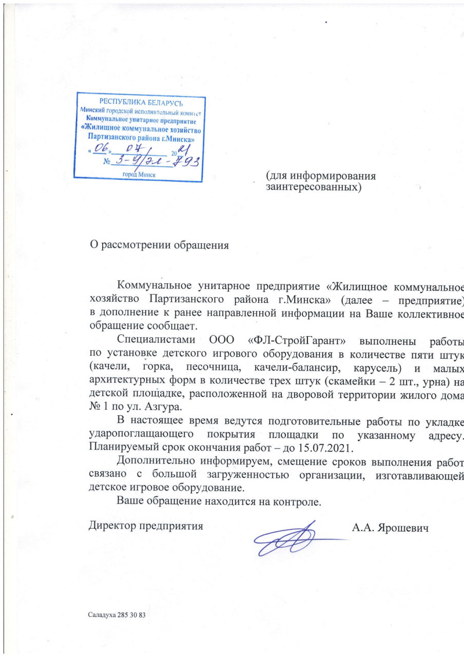 Во дворе домов №№1, 1А, 1Б по улице Азгура находится детская площадка. Эта площадка была установлена при сдаче дома в эксплуатацию - в 2001-2002 гг. Дому и самой площадке уже 18 лет, согласно В.12 ТКП 45-1.04-305-2016 Техническое состояние и техническое обслуживание зданий и сооружений основные требования срок эксплуатации у оборудования детских площадок - 5 лет. Более того нами были выявлены следующие нарушения требований технических нормативных правовых актов:
