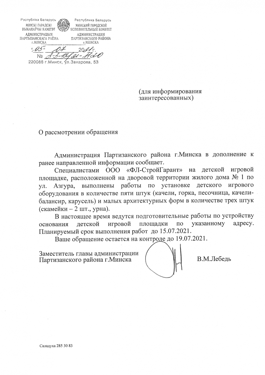 На детской площадке, расположенной на дворовой территории жилого дома №1 на ул.Азгура, выполнены работы по установке детского игрового оборудования в количестве пяти штук и малых архитектурных форм в количестве трёх штук. Планируемый срок выполнения работ по устройству основания детской площадки до 15.07.2021.