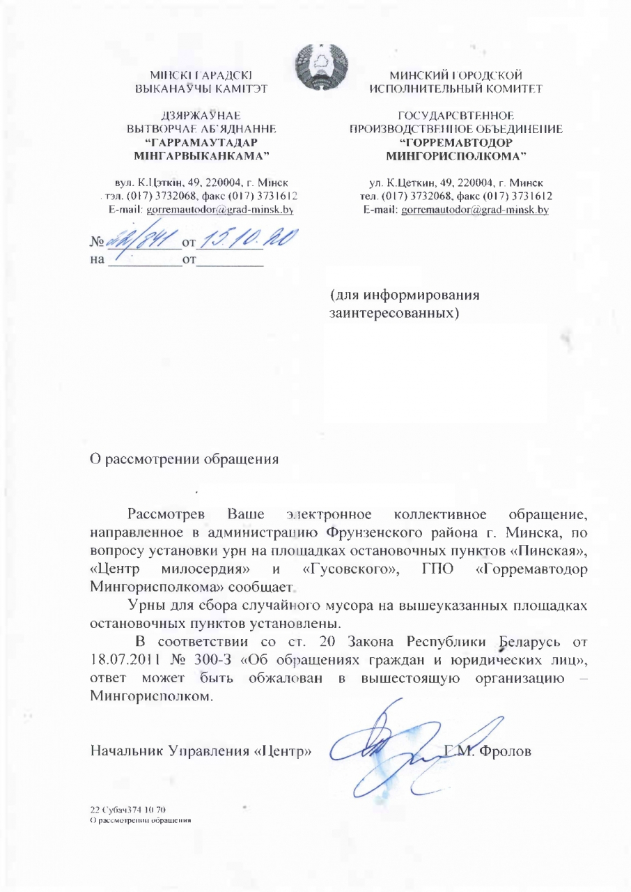 На основании изложенного требуем установить урны для мусора на остановках общественного транспорта "Пинская", "Центр Милосердия", "Гусовского".