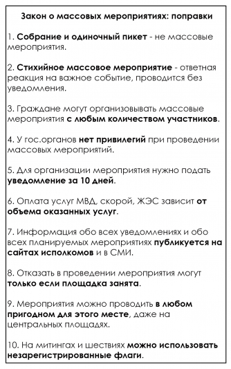 Выработанный порядок организации и проведения массовых мероприятий является оптимальным. В настоящее время инициирование вопроса о совершенствовании законодательства о массовых мероприятиях на основании поступивших предложений отдельной группы граждан не представляется целесообразным и возможным.