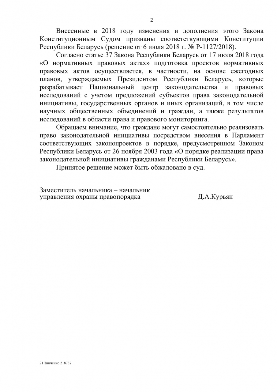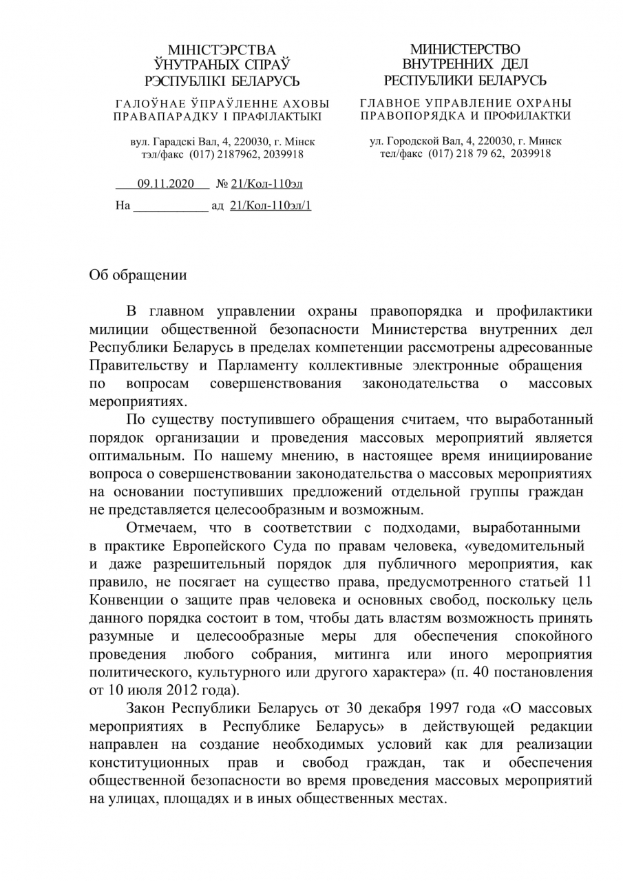 Приложения: 1. Законопроект «О внесении изменений и дополнений в Закон Республики Беларусь от 30 декабря 1997 г. N 114-З «О массовых мероприятиях в Республике Беларусь» на 4 л. в 1 экз.