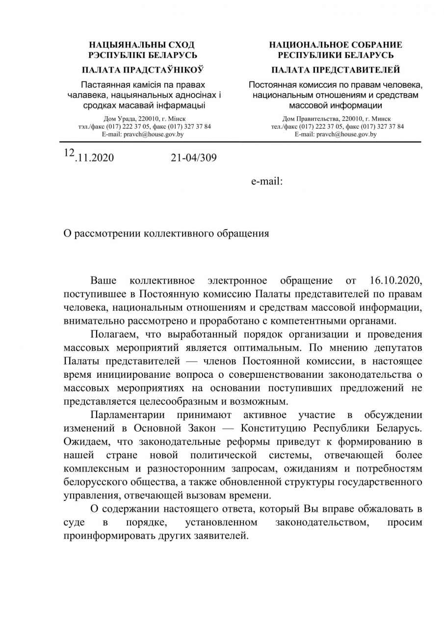 В соответствии с частью второй ст. 40 Закона настоящим мы, нижеподписавшиеся, вносим на рассмотрение законопроект «О внесении изменений и дополнений в Закон Республики Беларусь от 30 декабря 1997 г. N 114-З «О массовых мероприятиях в Республике Беларусь» и обращаемся к Вам как к субъекту нормотворческой инициативы с просьбой вынести на рассмотрение в Палате представителей данный законопроект.