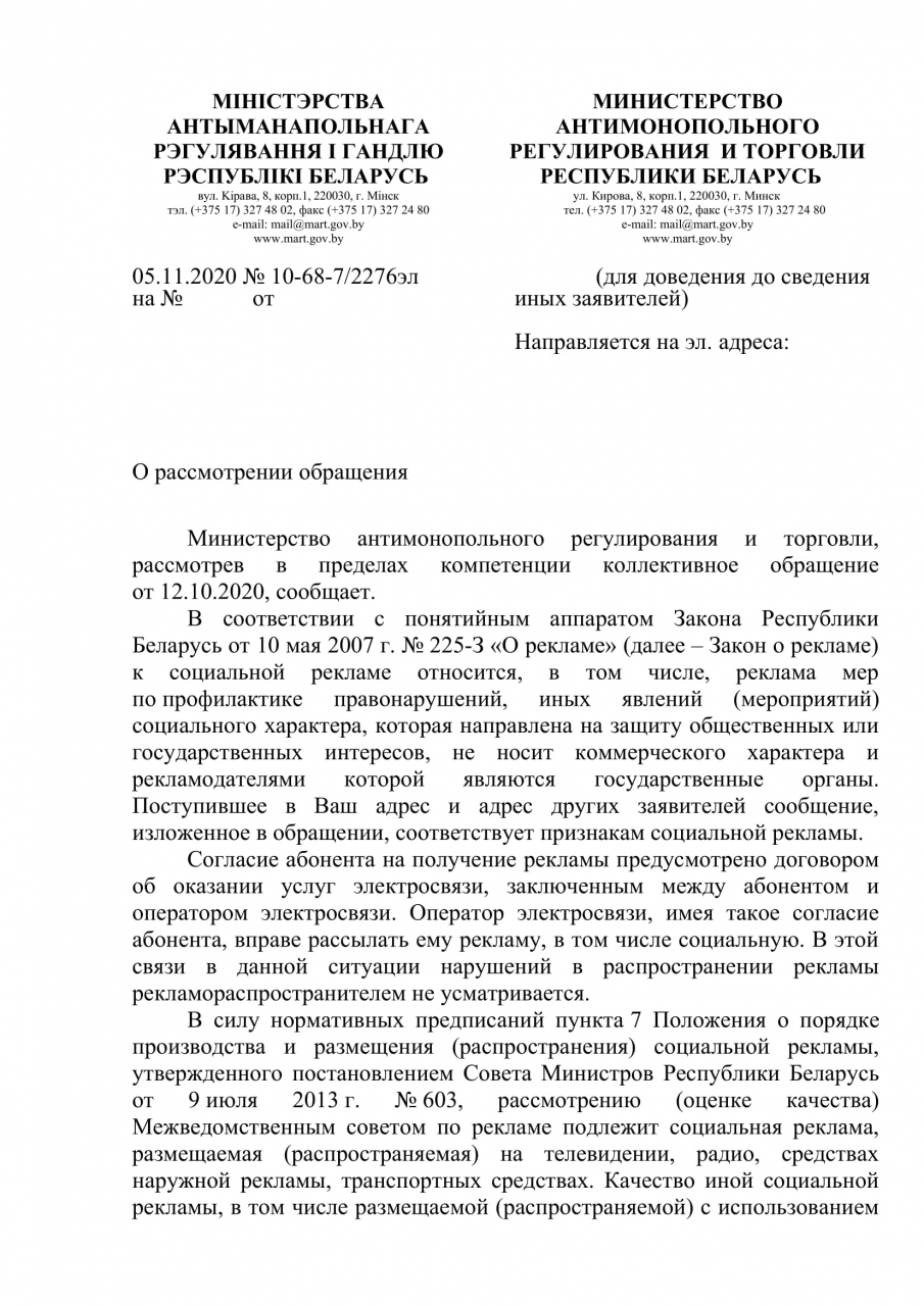 В соответствии с информацией, опубликованной на интернет-портале onliner.by 1 октября 2020 года https://tech.onliner.by/2020/10/01/grazhdanin-vy-narushitel-belorusy-poluchayut-novye-sms-ot-milicii , пресс-службы двух операторов мобильной связи (УП «А1» и ЗАО «БЕСТ») сообщили, что данные текстовые сообщения рассылались МВД РБ в соответствии с законодательством как социальная реклама, в СООО «Мобильные телесистемы» рекламный статус рассылки не подтвердили, однако также сообщили, что рассылка осуществляется МВД РБ.