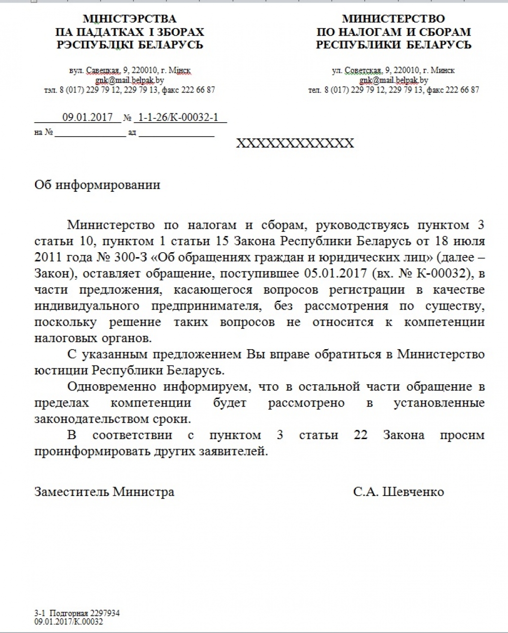 Обращение оставлено без рассмотрения в части предложения, касающегося вопросов регистрации в качестве индивидуального предпринимателя, поскольку решение таких вопросов не относится к компетенции налоговых органов.