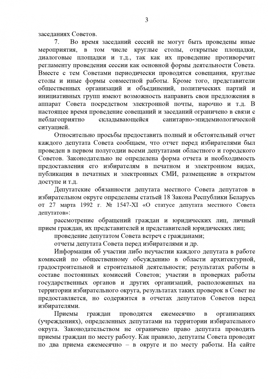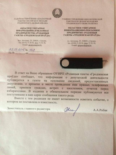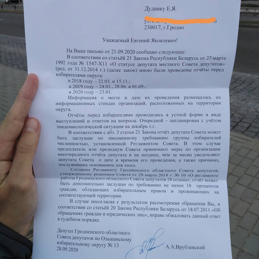 На наше обращение с просьбой прояснить ситуацию с вопросом «Почему газета «Гродненская правда не публикует информацию о времени, дате и месте отчетов депутатов перед избирателями, а также не публикует содержание этих отчетов для граждан, которые по различным причинам не смогли лично присутствовать на отчете депутата?» получен ответ за подписью главного редактора газеты «Гродненская правда» от 25.09.2020 за №247, что «информация о депутатской деятельности публикуется в газете на основании сведений, представленных депутатами», а «редакция не имеет возможности осветить, о котором не поставлена в известность».