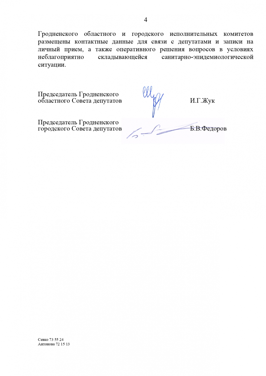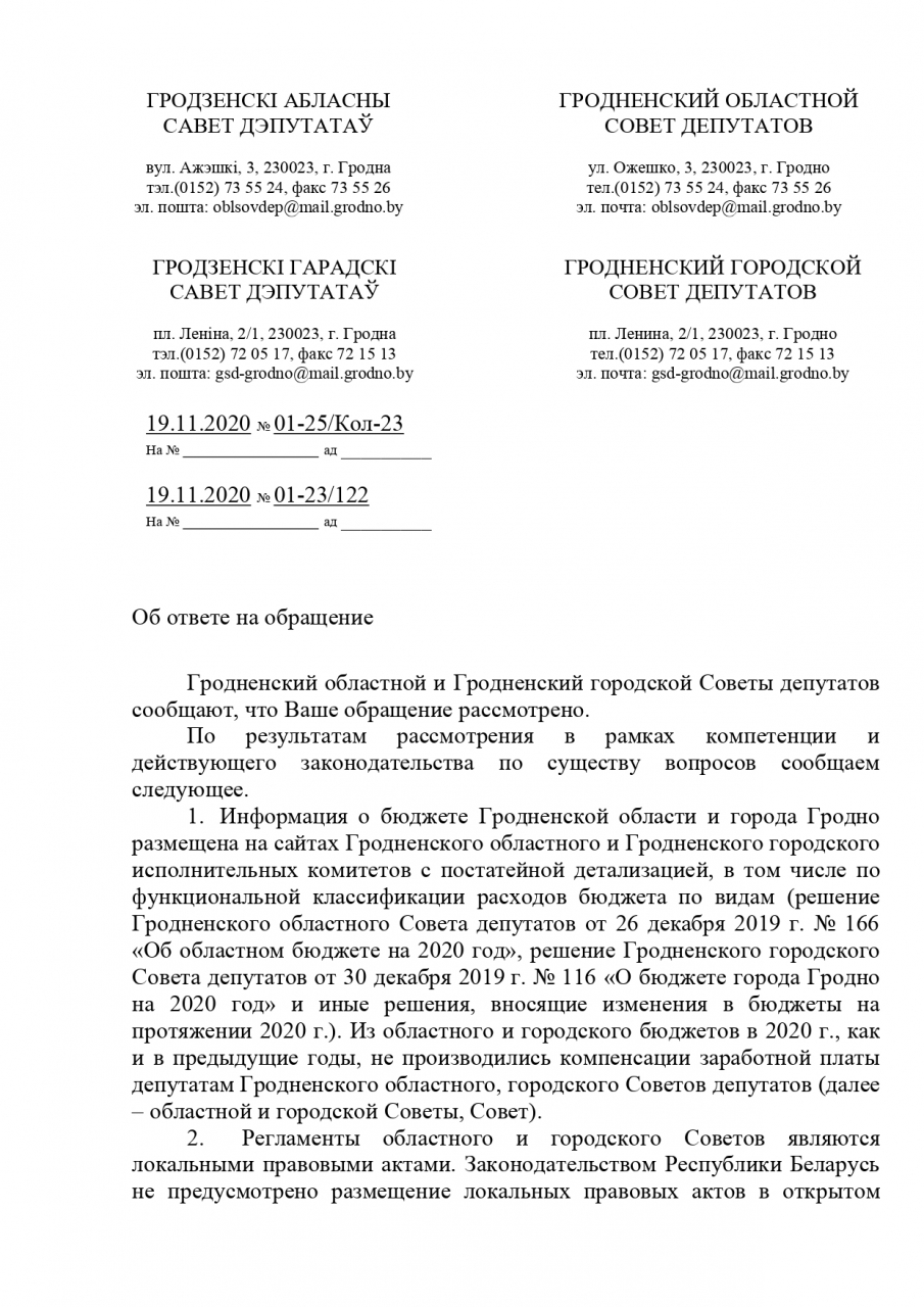 В соответствии с п.3 статьи 9 Закона «О местном управлении и самоуправлении» от 04 января 2010 года «Советы подотчетны в своей деятельности гражданам, ответственны перед ними». Требуем от вас как председателей Гродненского областного и городского Советов депутатов и их Президиумов по совместительству, исходя из возложенных на вас обязанностей и прав, предоставить гражданам Республики Беларусь информацию и опубликовать ее в печатном органе – газете «Гродненская правда»: