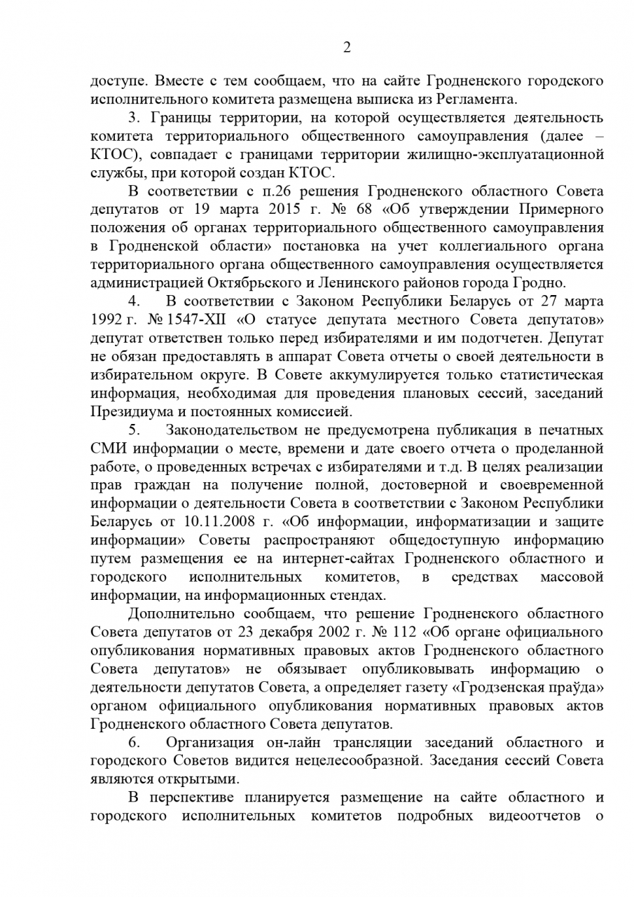 2. Дополнительно к печатному органу местных советов установить за счет местного бюджета или принять спонсорскую помощь от горожан он-лайн трансляцию с места заседаний депутатов Гродненского областного и городского Совета, подключив ютуб-канал к интернет страницам Гродненского областного и городского Советов депутатов или же сайта газеты «Гродненская правда»;