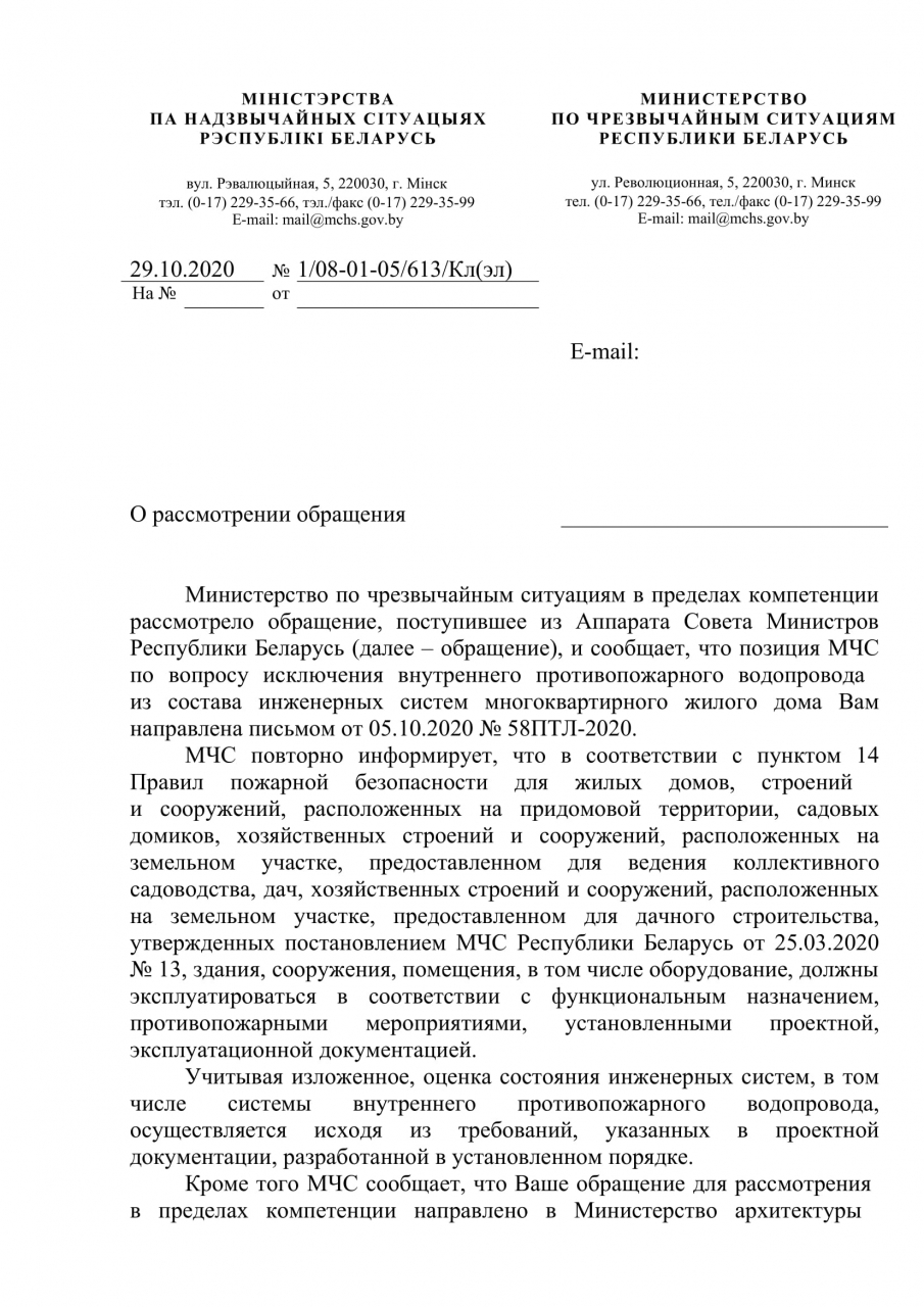 В связи со вступлением с 16.08.2020 новых СН 2.02.02-2019 «Противопожарное водоснабжение», согласно которых устройство противопожарного водоснабжения и пожарных кранов в многоквартирных жилых домах не является обязательным (за исключением высотных зданий), а также с целью оптимизации сокращения затрат, как граждан, так и местных бюджетов на обслуживание и восстановление этой инженерной системы.