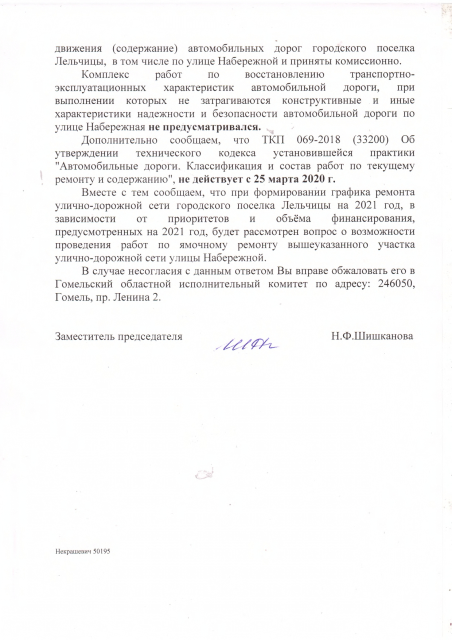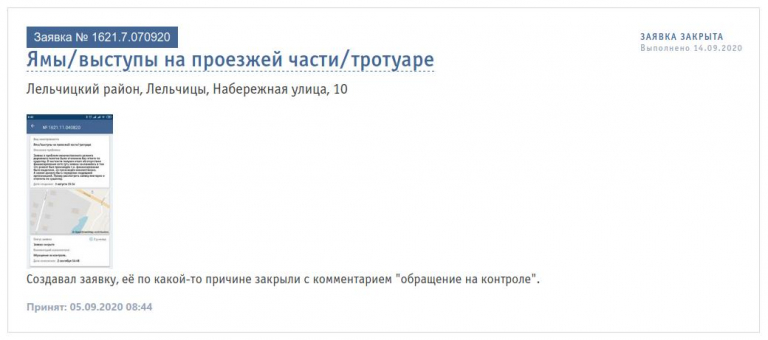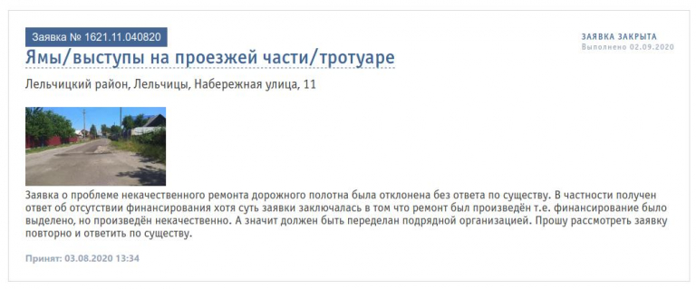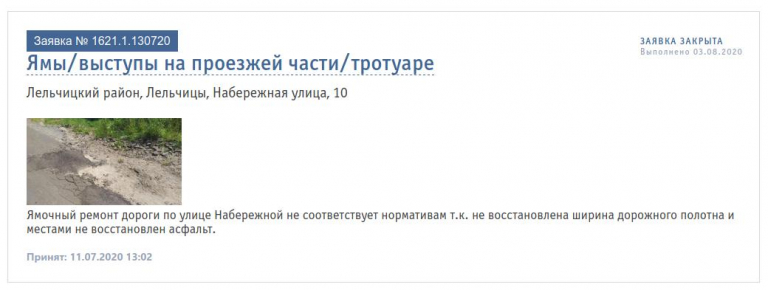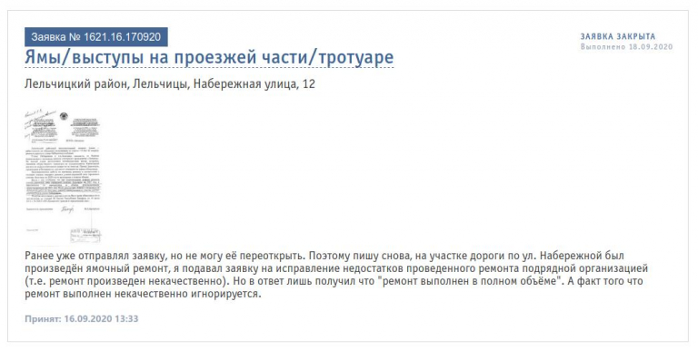К обращению прилагаем неоднократные обращения в службу ЖКХ посредством подачи заявок через сайт 115.бел. Фотоматериалы, иллюстрирующие качество и объём произведённых работ, а также ответ Лельчицкого ДРСУ №153 в адрес КПУП «Лельком» о качестве произведённых работ, который был предоставлен в качестве ответа на претензию о качестве произведённых работ.