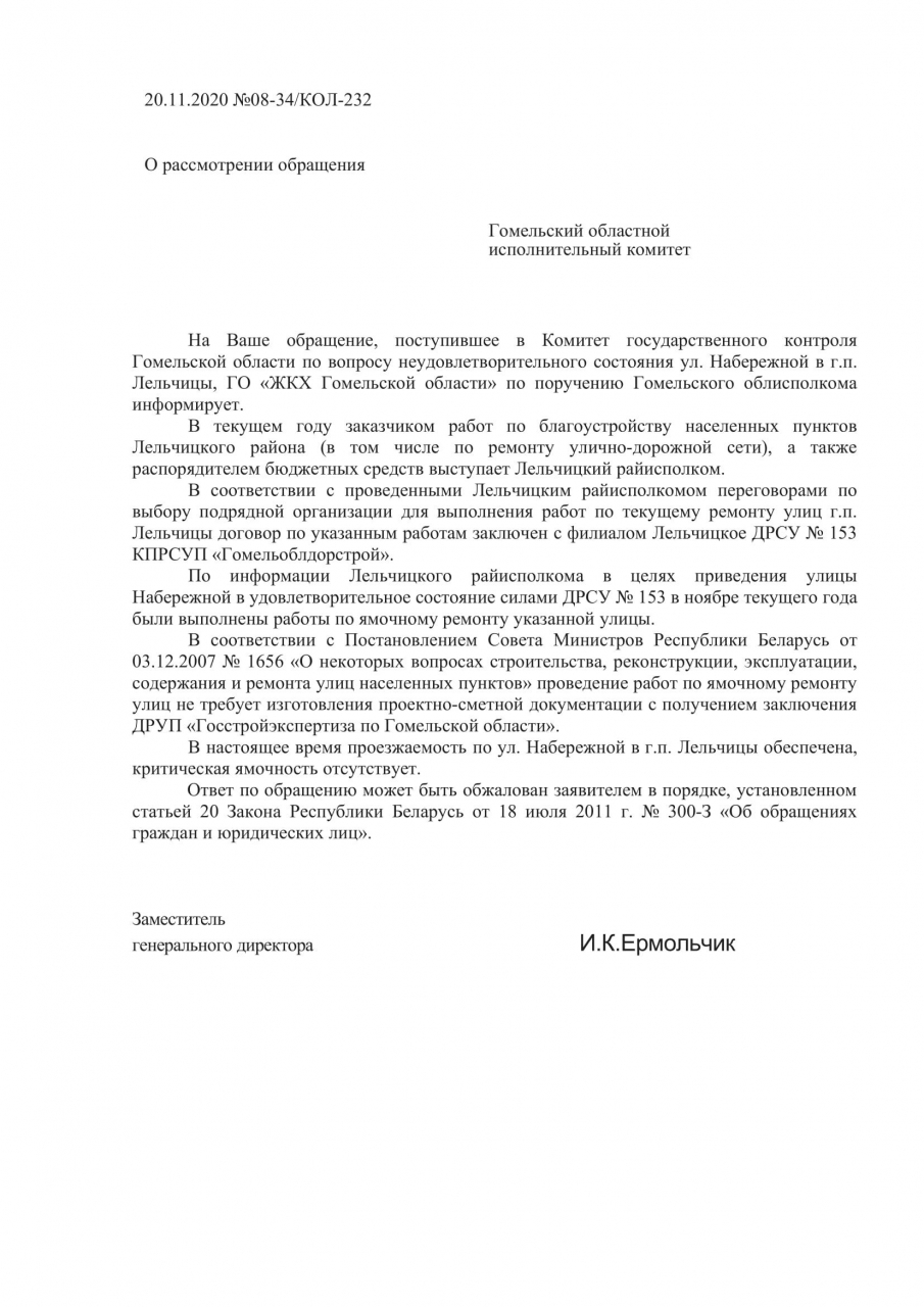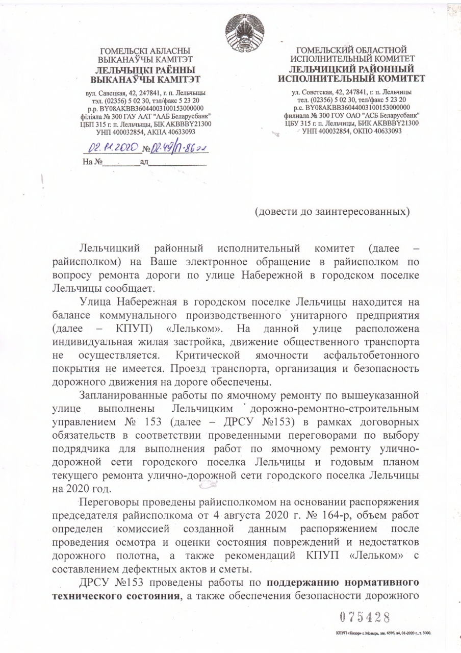 Просим провести проверку по признакам расходования бюджетных средств без контроля за качеством и количеством выполненных работ. В частности по проведённому в 2020 году плановому ремонту дорожного полотна по адресу: г.п.Лельчицы, ул.Набережная (в районе домов номер 9 и 11) коммунальным производственным унитарным предприятием «Лельком». Порядок проведения указанного ремонта, полагаем, является нарушением со стороны организации заказчика, а также имеет признаки того, что организация выполняющая работы, принимая на себя обязательства по восстановлению дороги, не выполняет требуемый объём работ и не соблюдает требования, госты и стандарты Республики Беларусь, предъявляемые к проводимым работам.