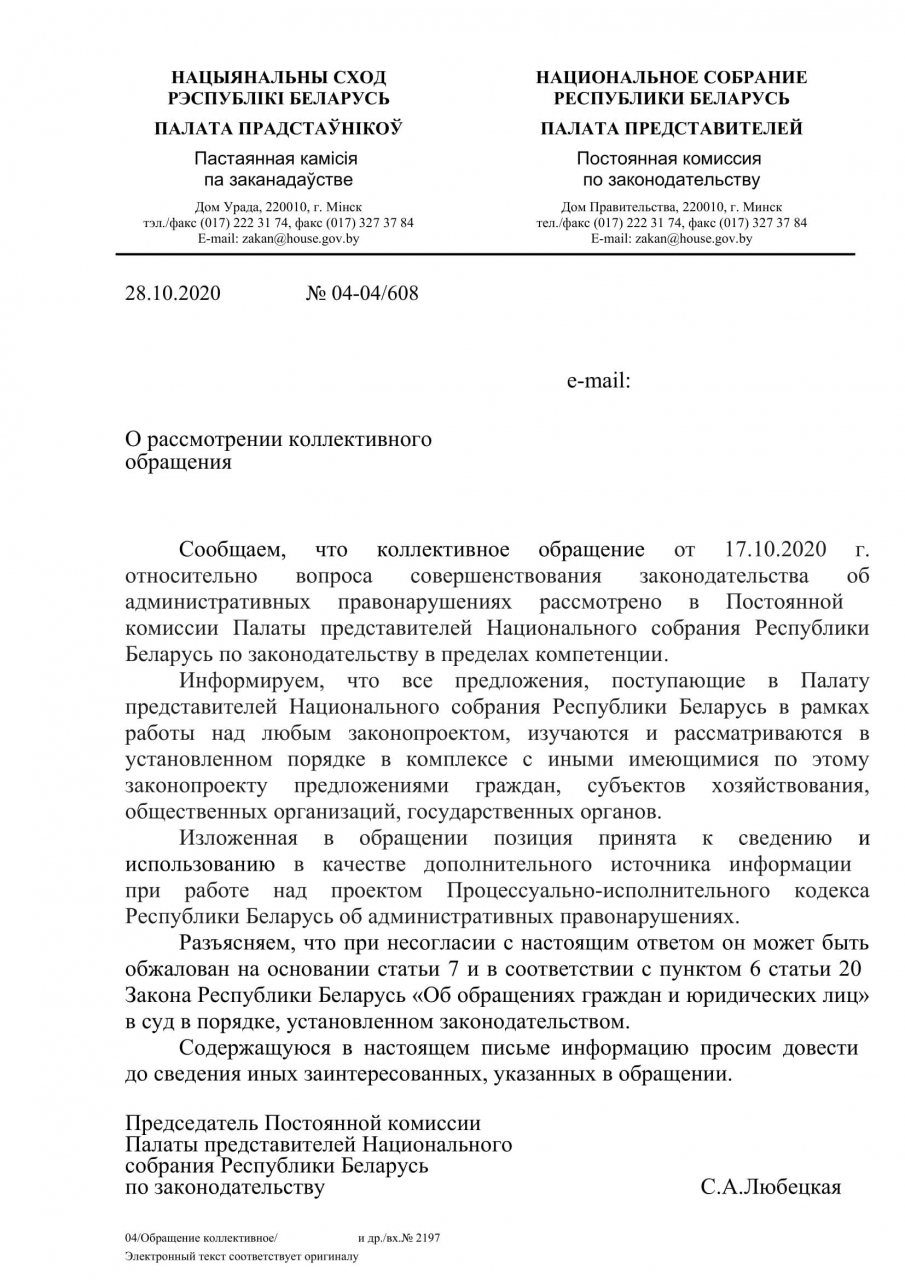 Считаем, эти поправки противоречат статьям 7, 34, 114 Конституции Республики Беларусь, иным нормам ПИКоАП, нормам Законов Республики Беларусь «Об органах внутренних дел», «Об оперативно-розыскной деятельности», а само предложение МВД является необоснованным, преждевременным и подлежит полной переработке. Мы, заявители обращения, против принятия поправок в Процессуальный кодекс, предложенных Министром МВД Ю.Х.Караевым.