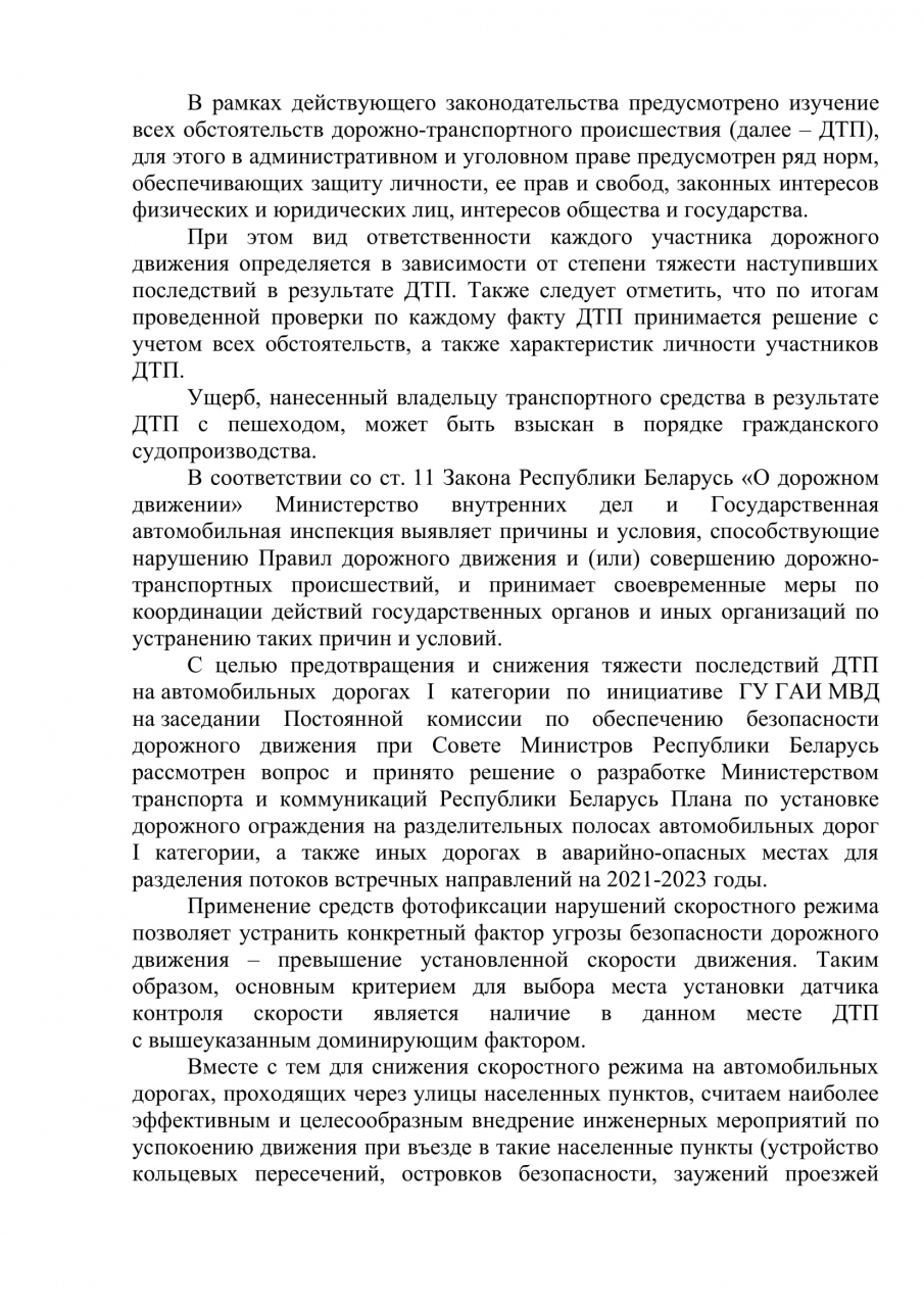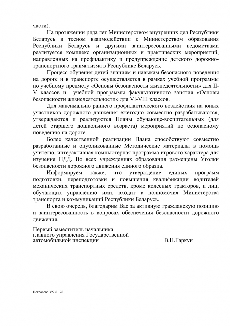 В соответствии с пп.17.1, пп.17.2. п.17 Положения о Государственной автомобильной инспекции Министерства внутренних дел Республики Беларусь основными функциями ГАИ являются, в том числе, выявление причин и условий, способствующих совершению дорожно-транспортных происшествий, нарушений Правил дорожного движения, иных противоправных действий в сфере безопасности дорожного движения, принятие в пределах своей компетенции мер по их устранению, а также разработка совместно с заинтересованными министерствами, другими государственными органами, предложений по повышению безопасности дорожного движения, предупреждению правонарушений в сфере дорожного движения.