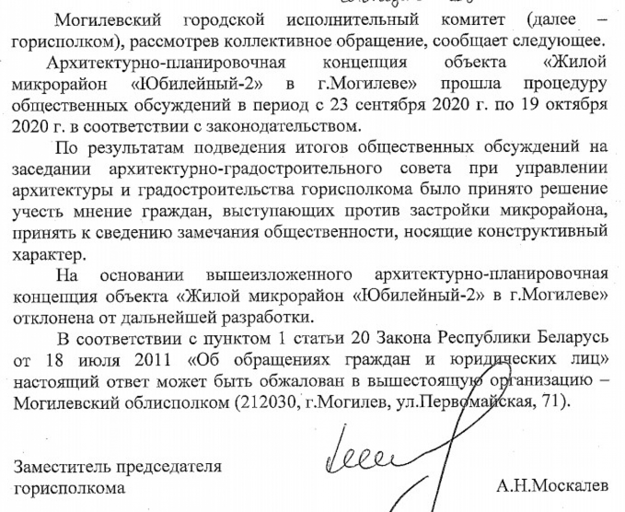 1. Мы возмущены тем, что о таком важнейшем для нас мероприятии, как обсуждение архитектурно-планировочной концепции объекта «Жилой микрорайон» Юбилейный-2» в г. Могилёве» (далее – Концепция), администрация Могилёвского горисполкома не известила лично председателя уличного комитета улицы Подгорной. Из-за этого мы как общественность не подготовились к этому мероприятию и, фактически, не приняли в нём участие. По этой причине мы не признаём, что должное общественное обсуждение вышеуказанной Концепции состоялось.