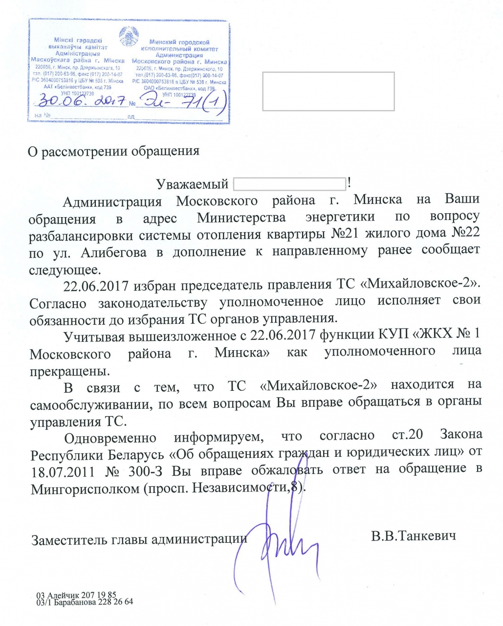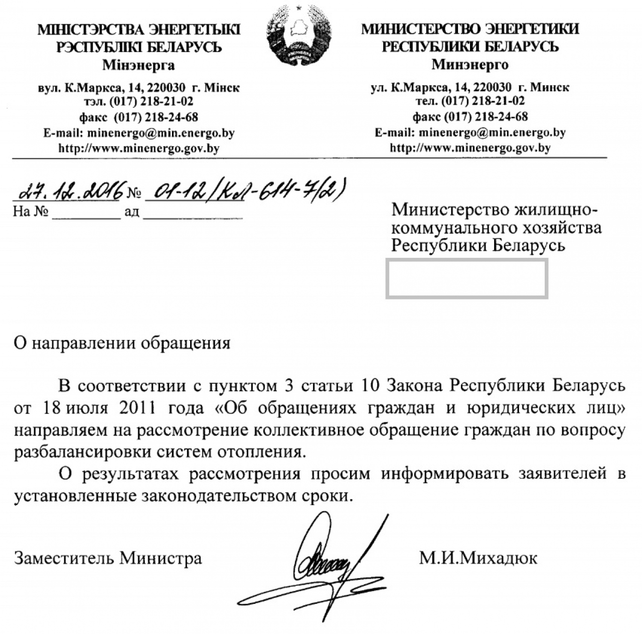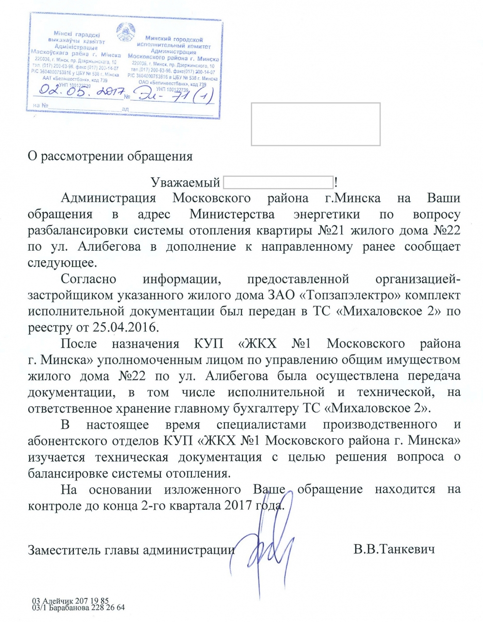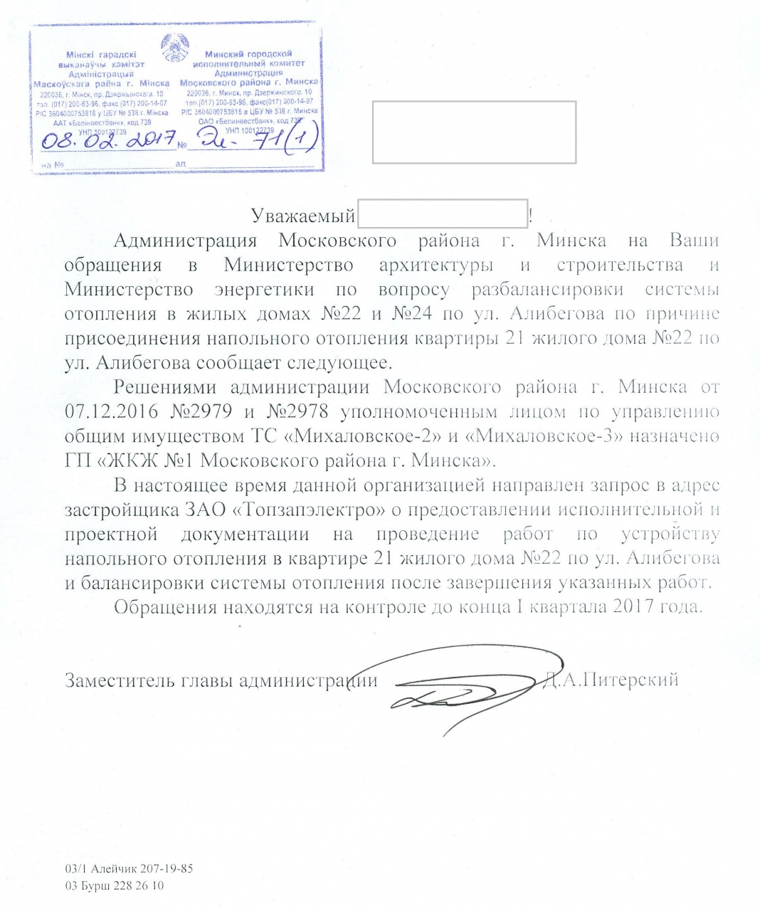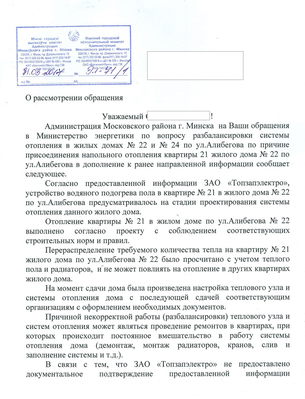 В связи с изменениями проектной документации застройщиком ЗАО Топзапэлектро, в 22 доме по ул. Алибегова, произведено устройство водяного подогрева полов в одной из квартир за счёт системы отопления жилого здания. Вместе с тем гидравлическая балансировка системы отопления домов 22 и 24 по ул. Алибегова в г. Минске не проводилась, по этой причине происходит не равномерный прогрев жилых помещений домов. Решением существующей проблемы в недогретых помещениях, является увеличение мощности насосов. Кроме того, при увеличении мощности насосов их энергопотребление растет. Повышение температуры теплоносителя приводит к значительному увеличению затрат на отопление и проблему не решает. Происходит неправильное распределение теплоносителя в системе отопления жилых домов, из-за ее гидравлического дисбаланса. Просим провести проверку законности устройства системы водяного отопления полов за счёт отопления жилого дома застройщиком, в случае нарушений обязать застройщика восстановить систему отопления жилого здания в соответствии с действующими нормами и правилами. Обязать застройщика провести балансировку системы отопления в рамках гарантийных обязательств, с целью равномерной подачи тепла во все жилые помещения жилых домов. Эксплуатирующей организации дать рекомендации в соответствии с государственной программой энергосбережения. Проинформировать о принятых мерах подписавших данное обращение граждан.