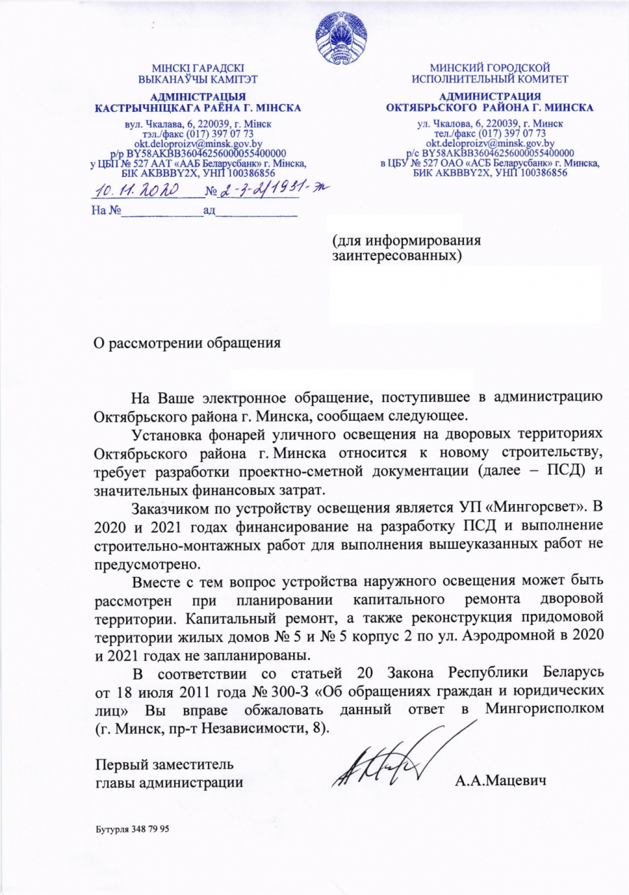 На основании изложенного требуем принять меры по организации освещения указанной территории.