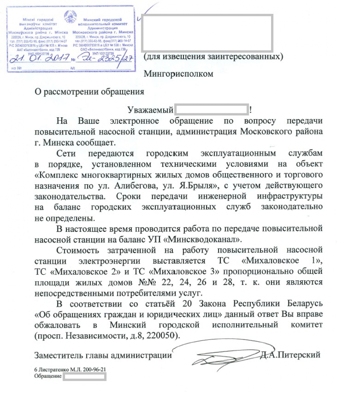 Просим дать ответ, по какой причине затягивается передача ПНС в УП "Минскводоканал". УП "Минскводоканал" просим разъяснить закладывается ли в стоимость потреблённой воды по приборам учёта населением стоимость электроэнергии ПНС и не взимается ли плата за потреблённую электроэнергию ПНС в нашем случае дважды. Просим определить сроки застройщику по передаче ПНС городу. Запрашиваемую информацию просим довести до граждан, подписавших данное обращение.